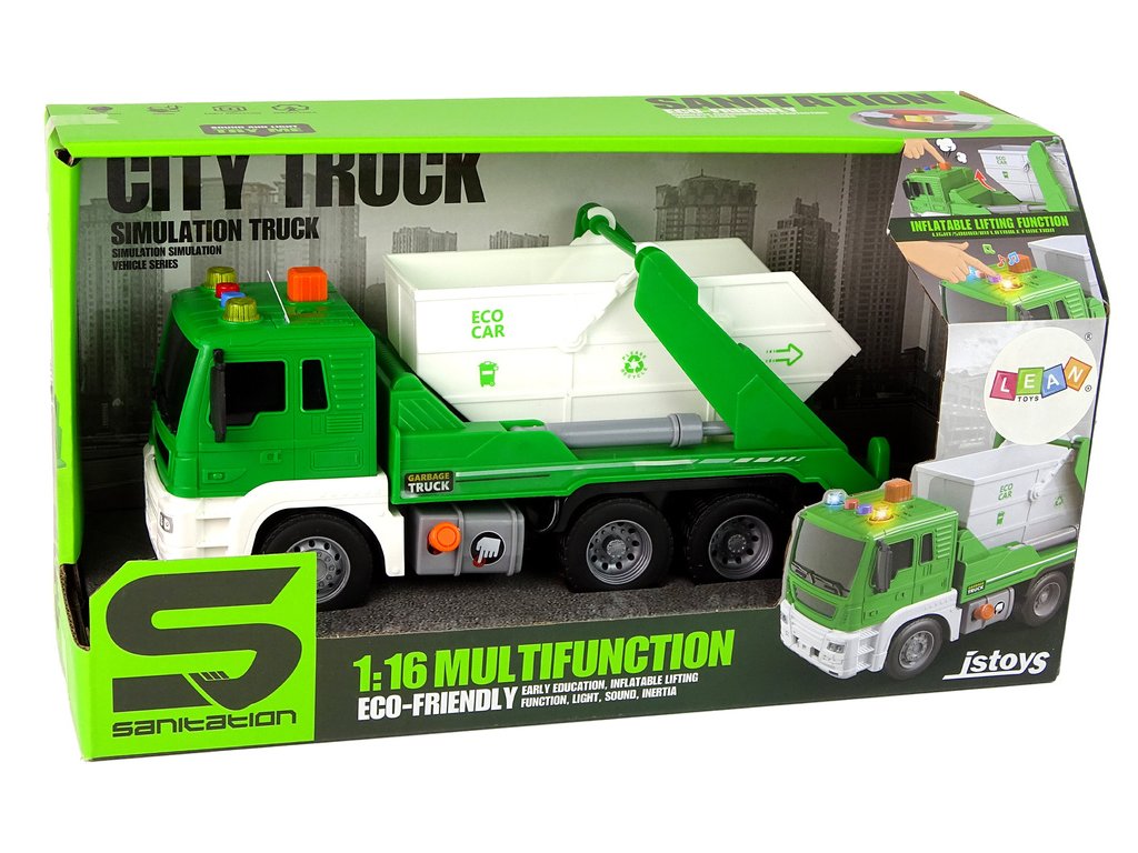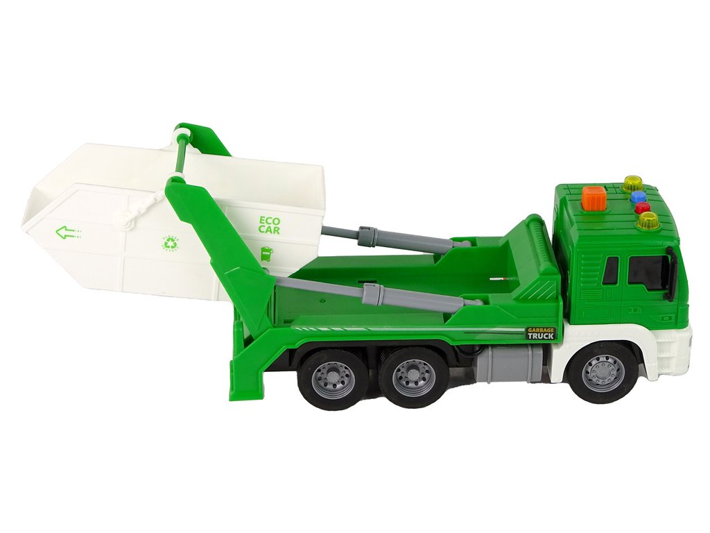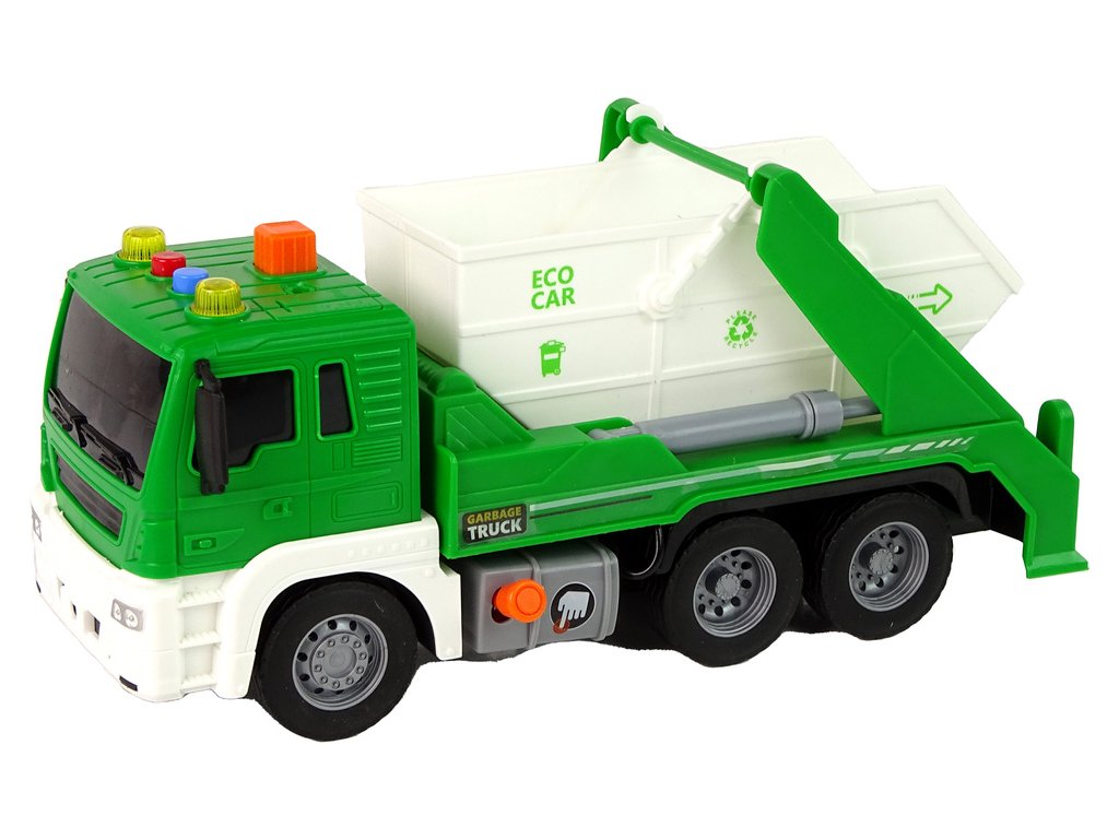 Popelářský vůz byl dokonale reprodukován, přičemž zelená barva přitahuje pozornost. Vozidlo má zadní nápravu s třecím pohonem na tlačení, stačí zatlačit na zadní, pustit dopředu a užívat si rychlost. Otevírací nádoba vám umožní vysypat odpadky na příslušné místo. Pro vysypání obsahu pomocí čerpadla lze celou nádobu zvednout dozadu.