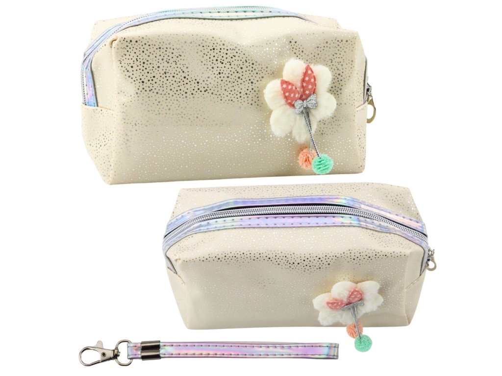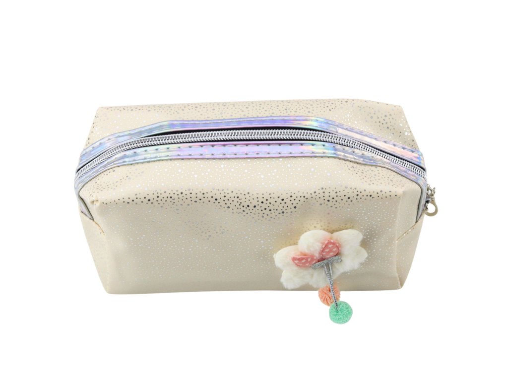 Stylový kosmetický penál je jedinečným doplňkem jakýchkoli školních pomůcek nebo každodenního použití. Vyrobeno v elegantní, béžové barvě, zdobené jemnými, lesklými částicemi, přitahuje pozornost svým jedinečným designem. Na přední straně penálu je půvabná aplikace v podobě nadýchaného obláčku s mašličkou, na kterou jsou připevněny dvě ozdobné kuličky, které dodávají celku jedinečné kouzlo.