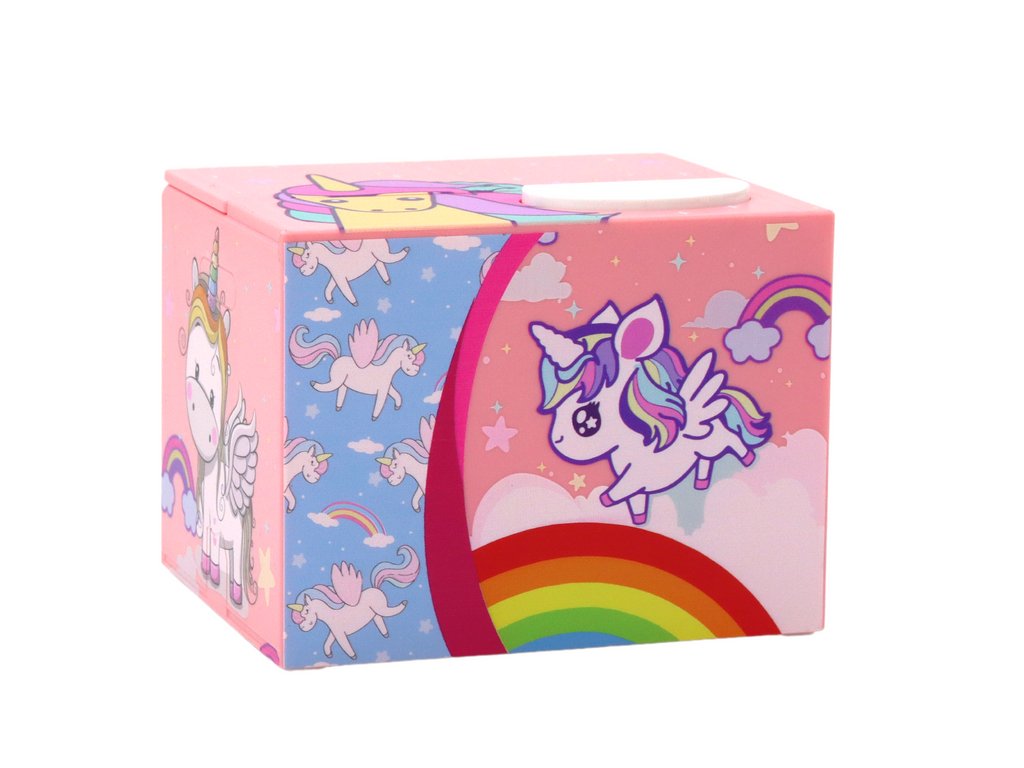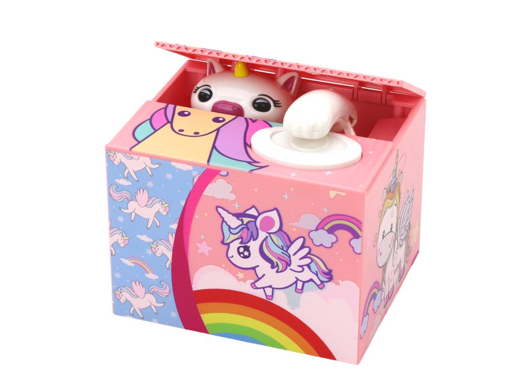 Toto okouzlující prasátko je nejen praktickým způsobem, jak ušetřit, ale také interaktivní hračkou, která poskytuje spoustu zábavy a povzbuzuje děti ke spoření. Prasátko má čtvercový tvar a je potaženo růžovou barvou s motivem jednorožce a duhy, díky čemuž je pro děti atraktivní.