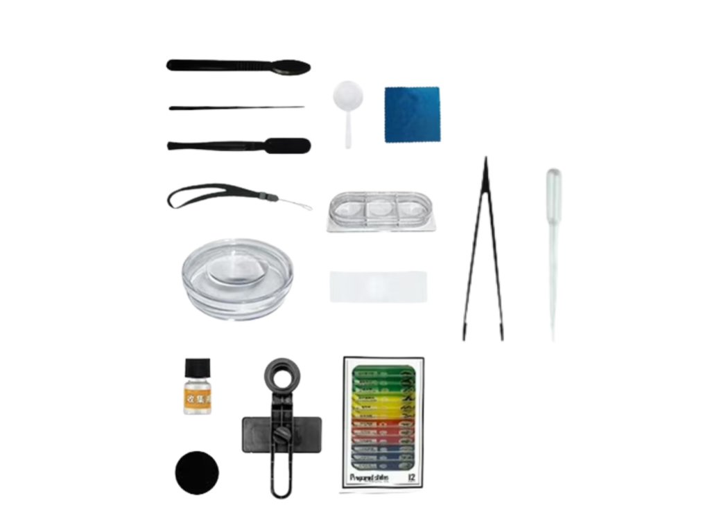 Mikroskop má nastavitelné zaostření a zoom, což vám umožní přizpůsobit obraz zkoumanému objektu. Sada obsahuje ucelenou sadu příslušenství: stojánek s LED osvětlením, hotová pozorovací sklíčka, prázdná sklíčka, pipetu, pinzetu, nůž, lupu, držák na telefon pro pohodlné prohlížení a fotografování.