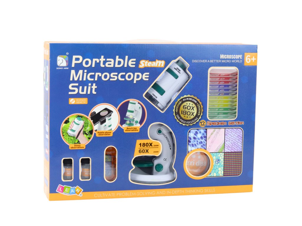 Tento přenosný vzdělávací mikroskop 2 v 1 je perfektní sada pro mladé vědce, kteří chtějí prozkoumat fascinující svět mikrobiologie. Díky 60x a 180x zvětšení a vestavěnému LED osvětlení mohou děti pozorovat mimořádné detaily světa kolem sebe – od vlasů a látek po hmyz, listí a další exempláře.