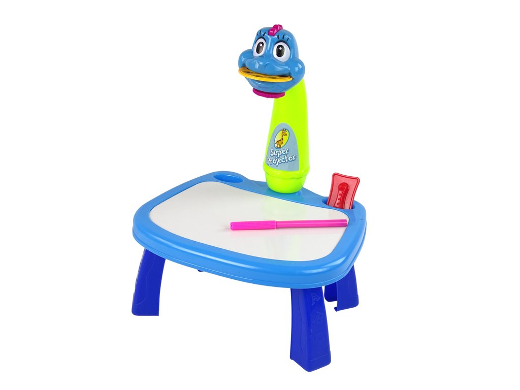 Speciální projektor ve tvaru hlavy dinosaura zobrazuje na tabuli obrázky, které děti obkreslují přiloženými fixami. Stolek s projektorem je senzační hračka a skvělá vychytávka pro všechny děti, které milují kreslení.