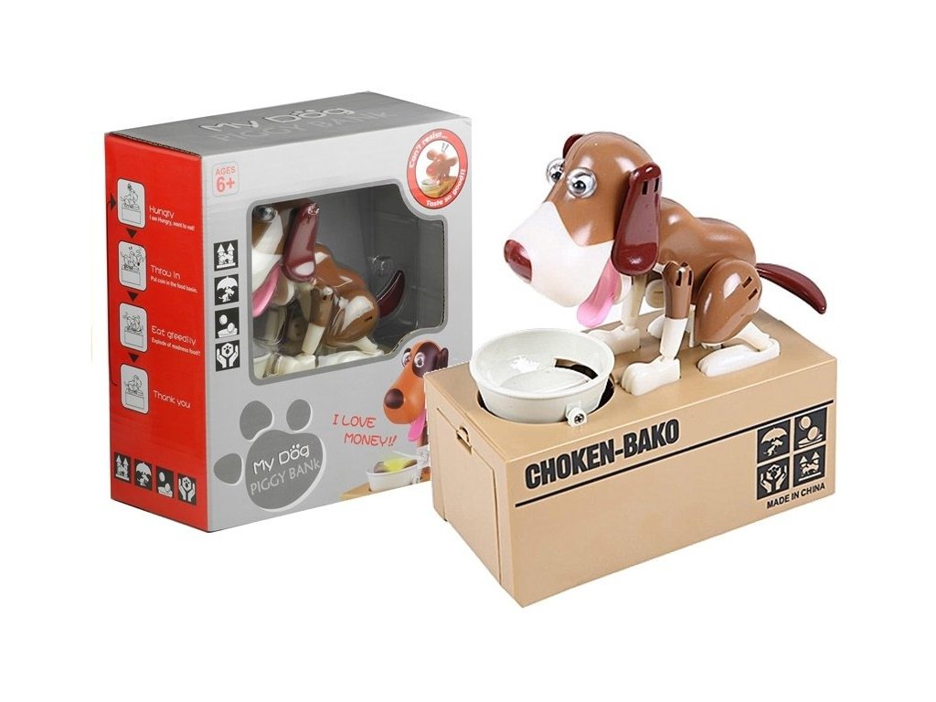 Toto úžasné prasátko se skládá z velké truhly, která drží peníze vašeho miminka, pohyblivé misky s přihrádkou na mince a energického psa, který při vydávání zvuků pohybuje očima, ušima, jazykem a ocasem. Béžovou krabičku zdobí nápis Choken-Bako a čtyři obrázky, přičemž pejsek sedící na jejím obalu má světle růžový jazyk, tmavě hnědý nos a skvrnitou bílou a hnědou barvu.