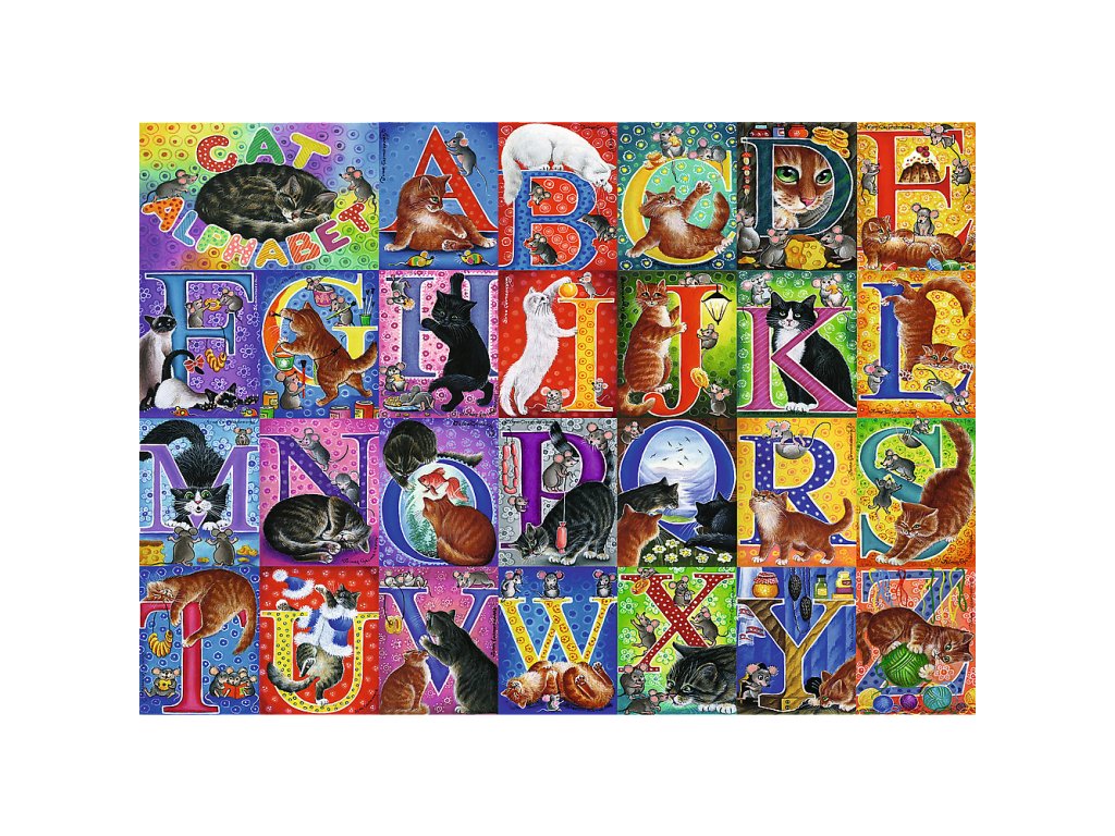 Puzzle Kočičí abeceda se skládá z 500 dílků a představuje malovanou koláž skládající se z písmen a vtipných koťátek. Hotové puzzle má rozměr 480x340 mm.