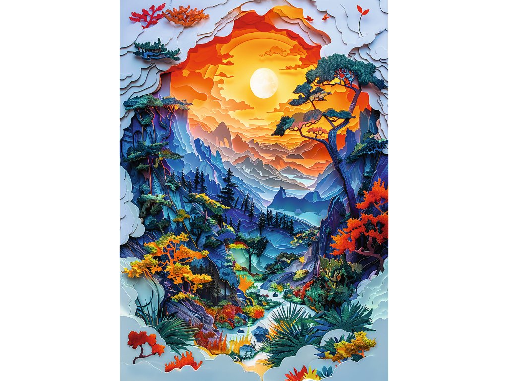 Uprostřed balení vidíme úžasnou, vícevrstvou krajinu, která díky speciální grafice napodobuje efekt 3D prvků, takže celá sada byla navržena tak, aby jednotlivé skály byly<. vrstvy mraků) vypadají, jako by se překrývaly papírové výřezy – takže když složíte 1000 dílků, budete mít pocit, jako byste tuto barevnou, trojrozměrnou krajinu stavěli sami.