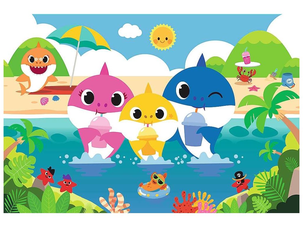 puzzle se skládá z 60 dílků a umožňuje sestavit mimořádně barevný obrázek rodiny Baby Shark na dovolené. sestavený obrázek měří 33 x 22 cm.