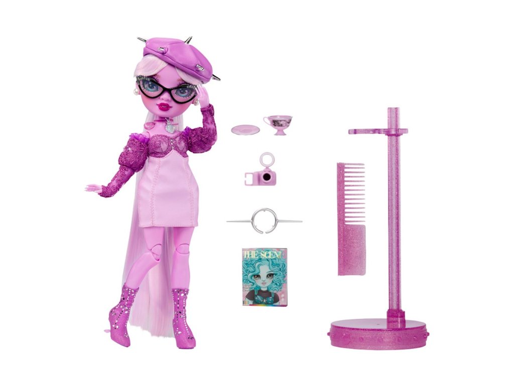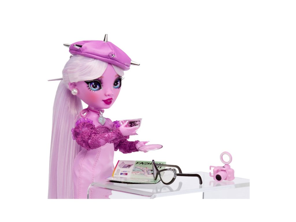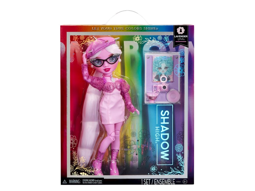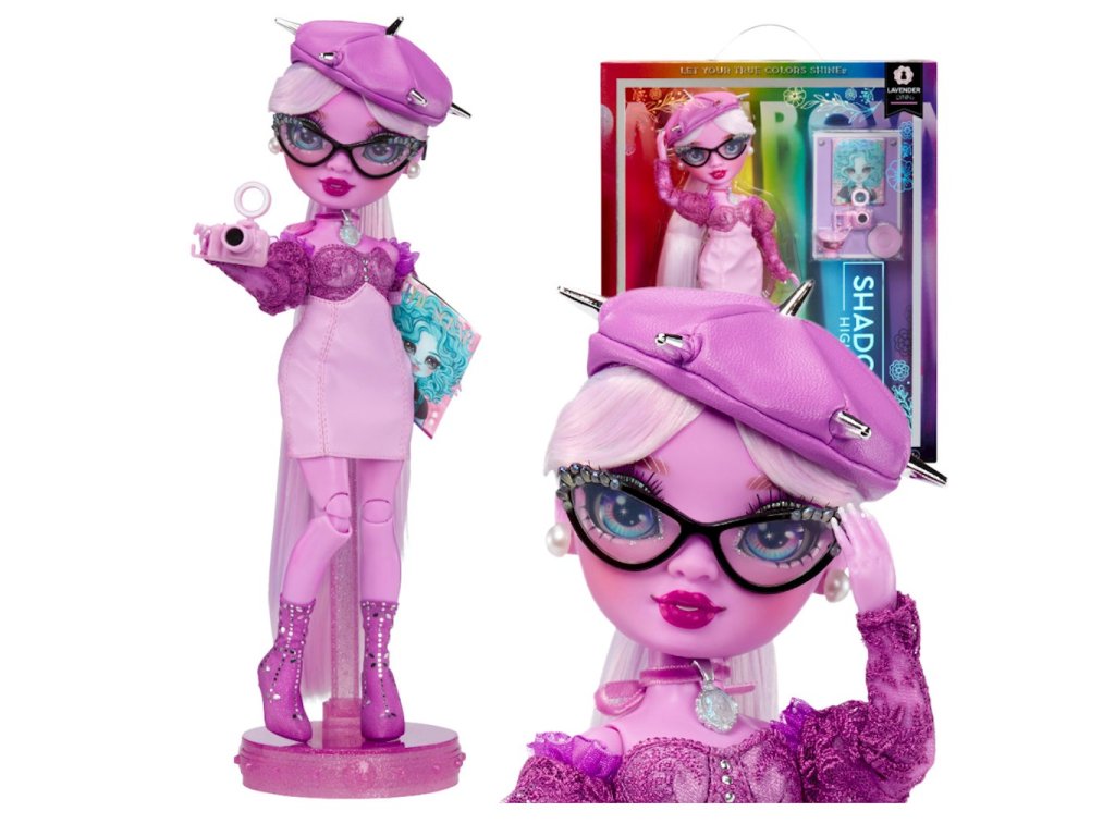 Rainbow High Shadow High Panenka Lavender Lynn 592815Studentky Rainbow High a Shadow High jsou módní a pohodové. Kamarádky Ruby, Poppy, Sunny, Skyler a Violet navštěvují tu nejneobyčejnější uměleckou školu na světě a vytvářejí stylové oblečení a nádherné doplňky. Na Shadow High jsou všechny studentky kreativní; Lavender Lynn miluje fotografování a focení fotoaparátem; inspiraci nachází v prohlížení svého oblíbeného časopisu během přestávky na čaj. Lavender zdůrazňuje svůj styl šaty s krajkovými detaily, kotníkovými botami, perlovými náušnicemi, náhrdelníkem s přívěskem a baretem; má decentní brýle, pravé řasy a skleněné oči; její extra dlouhé vlasy jsou stažené do culíku.