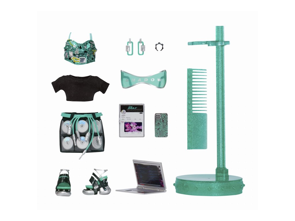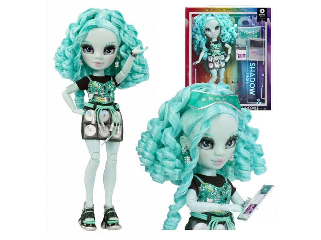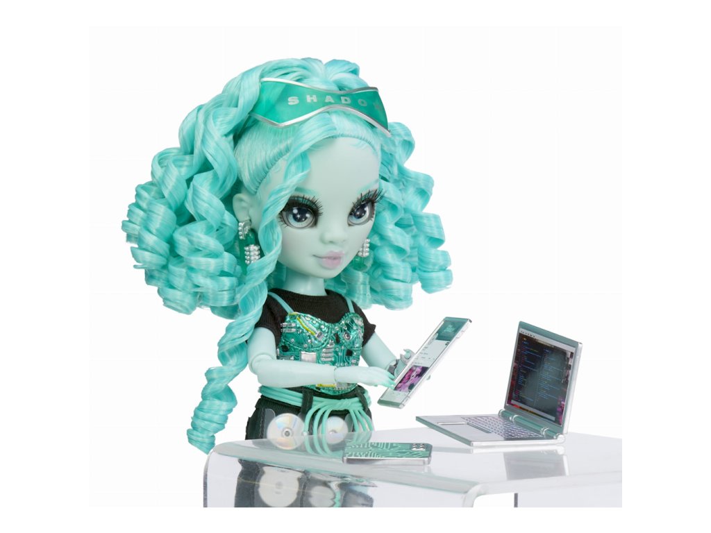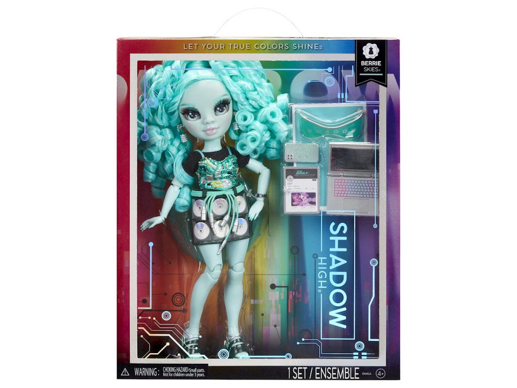 Rainbow High Shadow Berrie Skies Panenka 529808Na Shadow High jsou všichni studenti kreativní, obor počítačová animace, Berrie Skies má všechno potřebuje vytvořit své animované filmy – notebook, tablet, a mobilní telefon. Berrie Skies je oblečená od hlavy až k patě v nebesky modré. Vyjadřuje ji vlastní styl v třpytivém tílku, černém tričku, sukně s průhlednými vinylovými kapsami, které obsahují grafiku CD, lisovaný pásek, náušnice, náramek a vysoké podpatky. Také nosí sluneční brýle. Její výjimečně kudrnatá, výjimečně husté, modré vlasy jsou svázány do vysokého culíku.