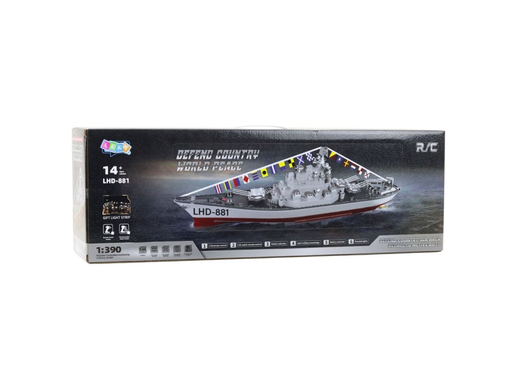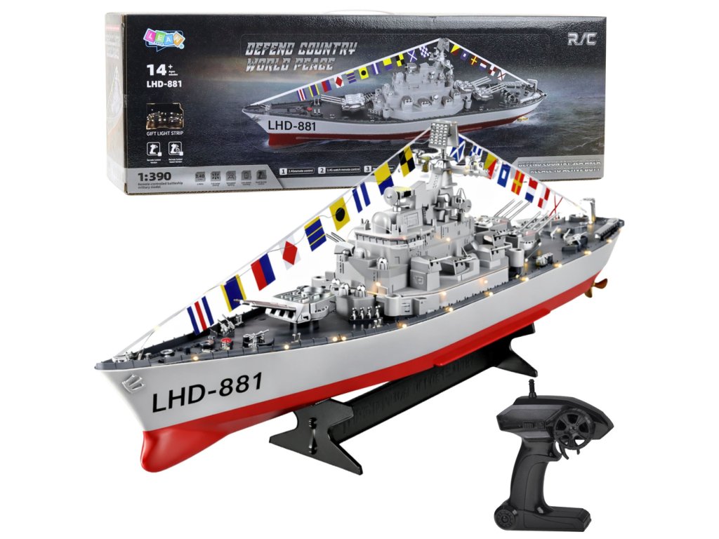 DÁLKOVĚ OVLÁDANÁ VÁLEČNÁ LOĎ SE SVĚTLY A VLAJKAMI