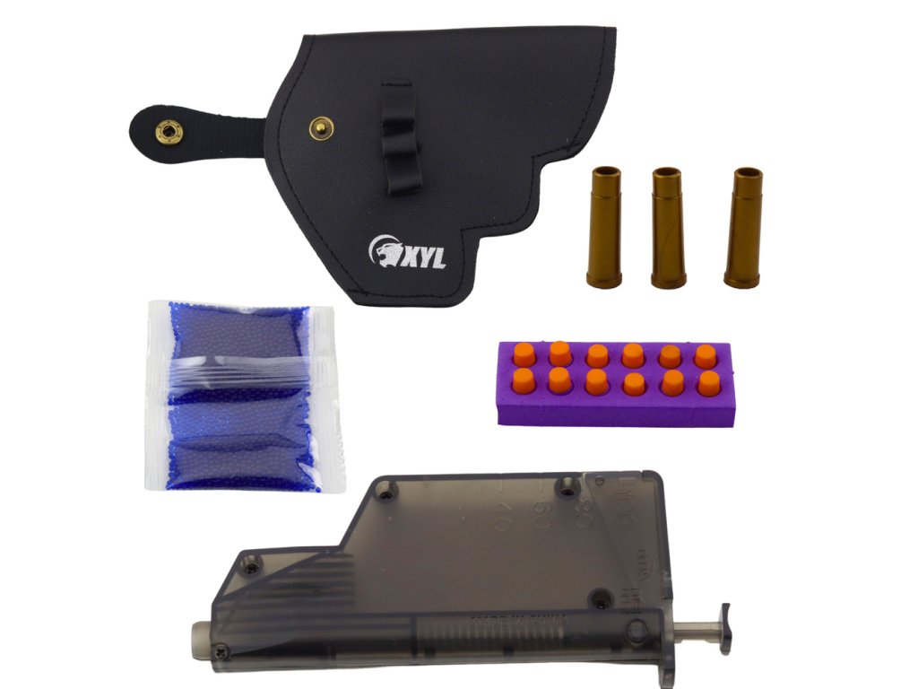 Sada obsahuje kompletní sadu příslušenství – včetně pouzdra z imitace kůže, zásobníku, sady 12 nábojů, 12 pěnových nábojů, balení gelových kuliček a barevného terče pro nácvik míření. Všechny prvky byly pečlivě navrženy s ohledem na intuitivní ovládání. Nabíjecí mechanismus funguje hladce a použití měkkých materiálů v munici účinně eliminuje riziko zranění.