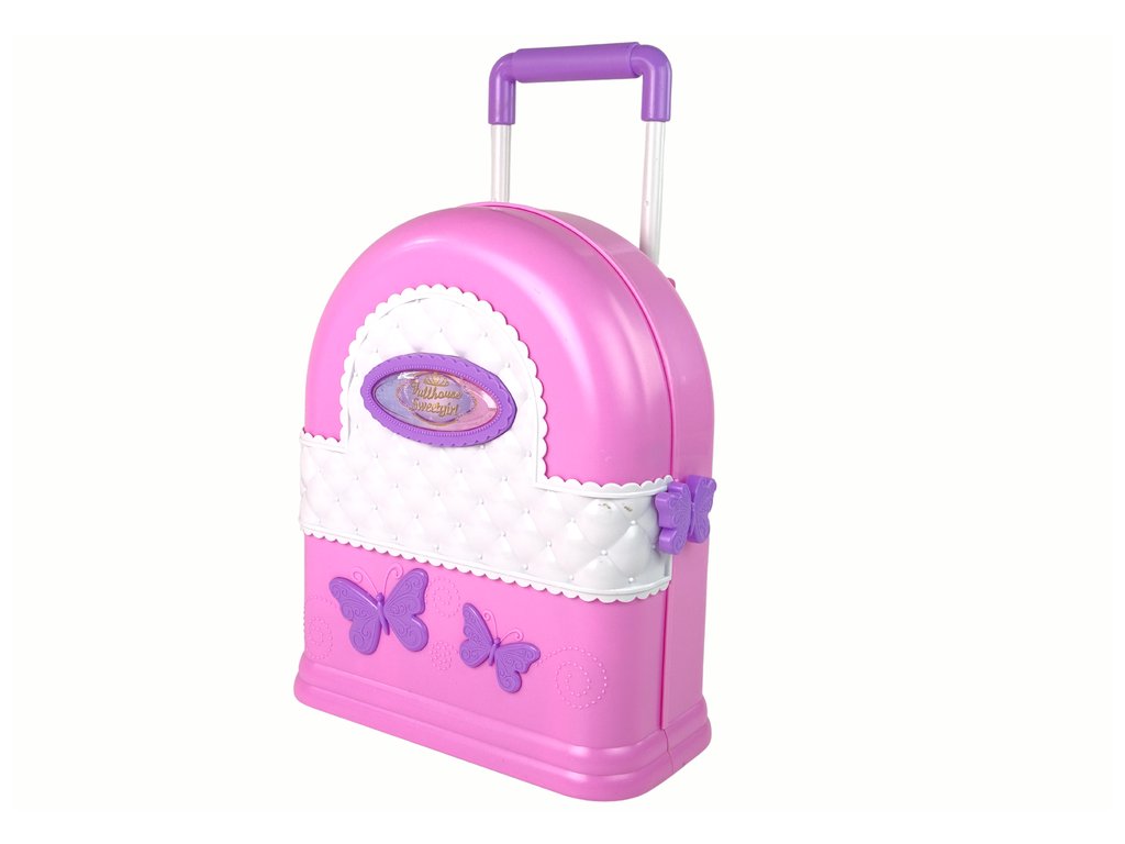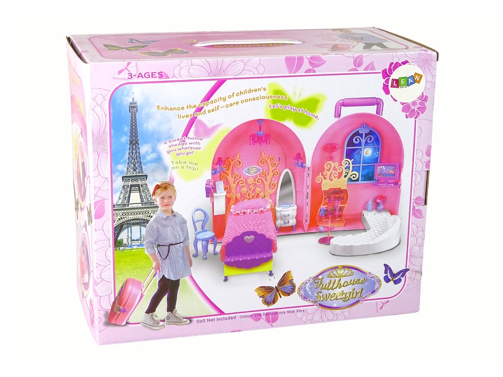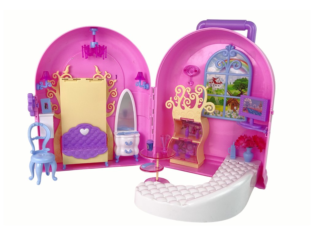 Po sestavení domeček připomíná velmi holčičí kufřík pastelové barvy s dlouhým uchem. Jasné růžové a fialové barvy jsou kombinovány s bílými doplňky, které jistě osloví každou dívku. Vnitřek kufříku ukrývá kompletní sadu předmětů potřebných ke hře s panenkou.