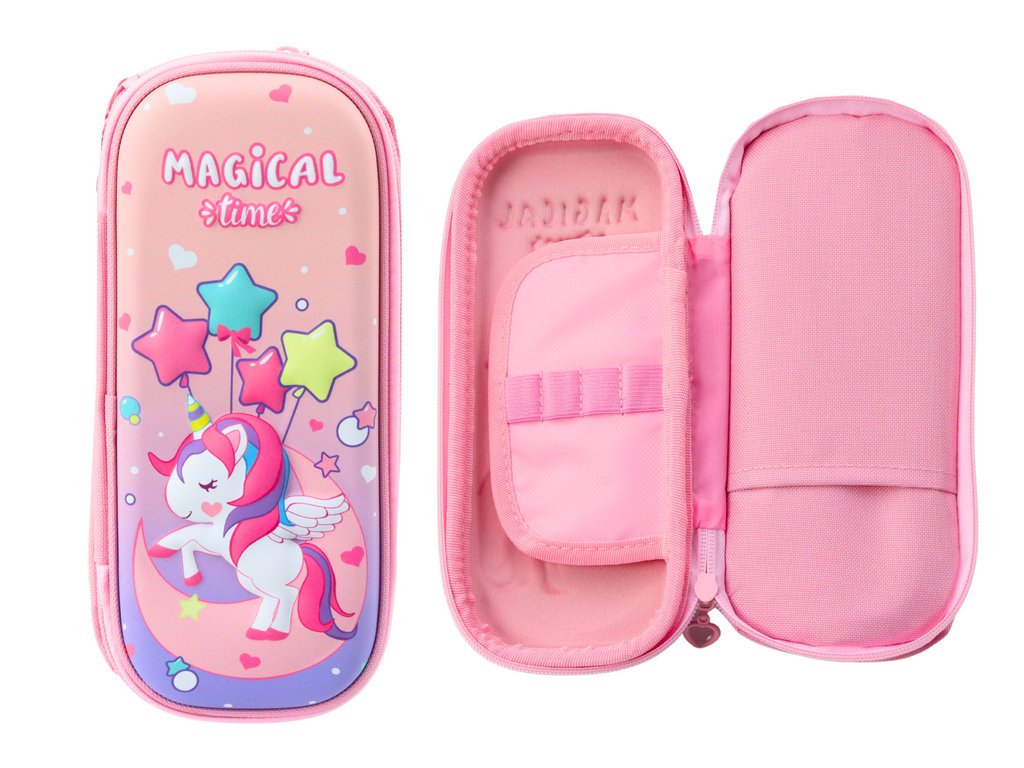Růžový penál s 3D jednorožcem Dvoukomorový 24 cm x 11 cm x 7 cm