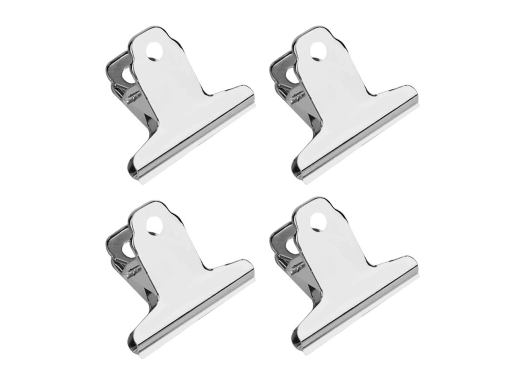 Vyrobeny z odolného kovu, klipy jsou odolné proti opotřebení a opakovanému použití. Jejich jednoduchý tvar a lesklá chromovaná povrchová úprava jim dodává profesionální vzhled a otvor v rukojeti umožňuje jejich zavěšení na prkno nebo háček.