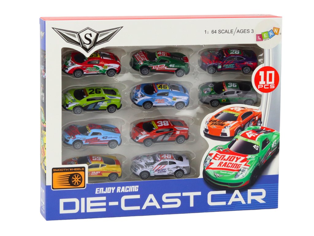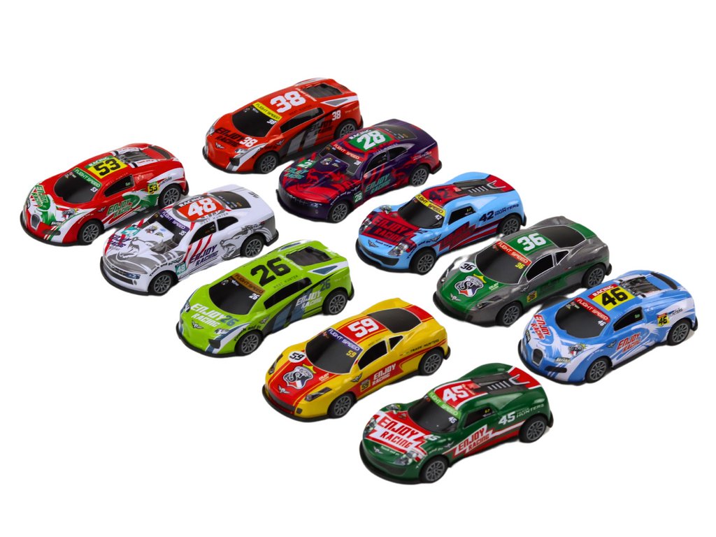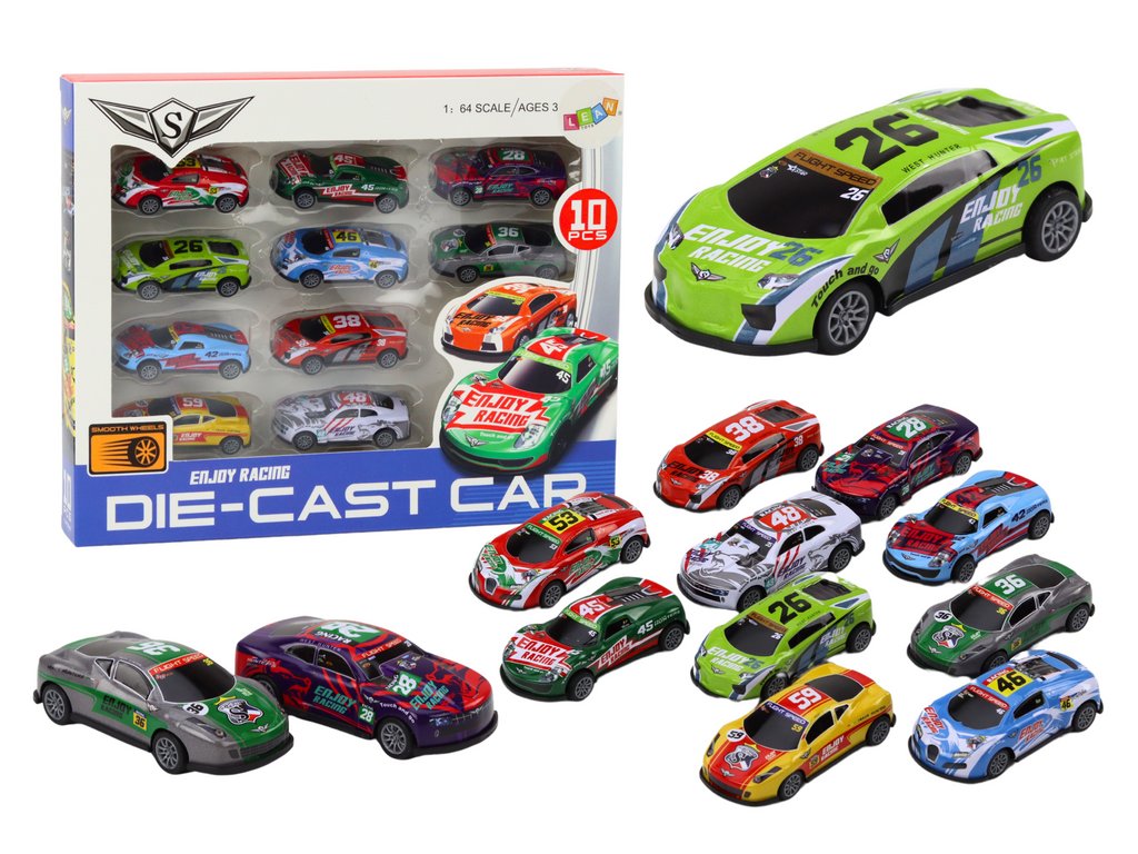 Sada autíček, pružiny, sportovní závodní autíčka 1:64, 10 ks.
