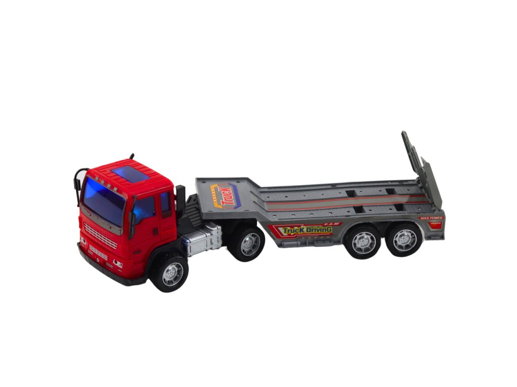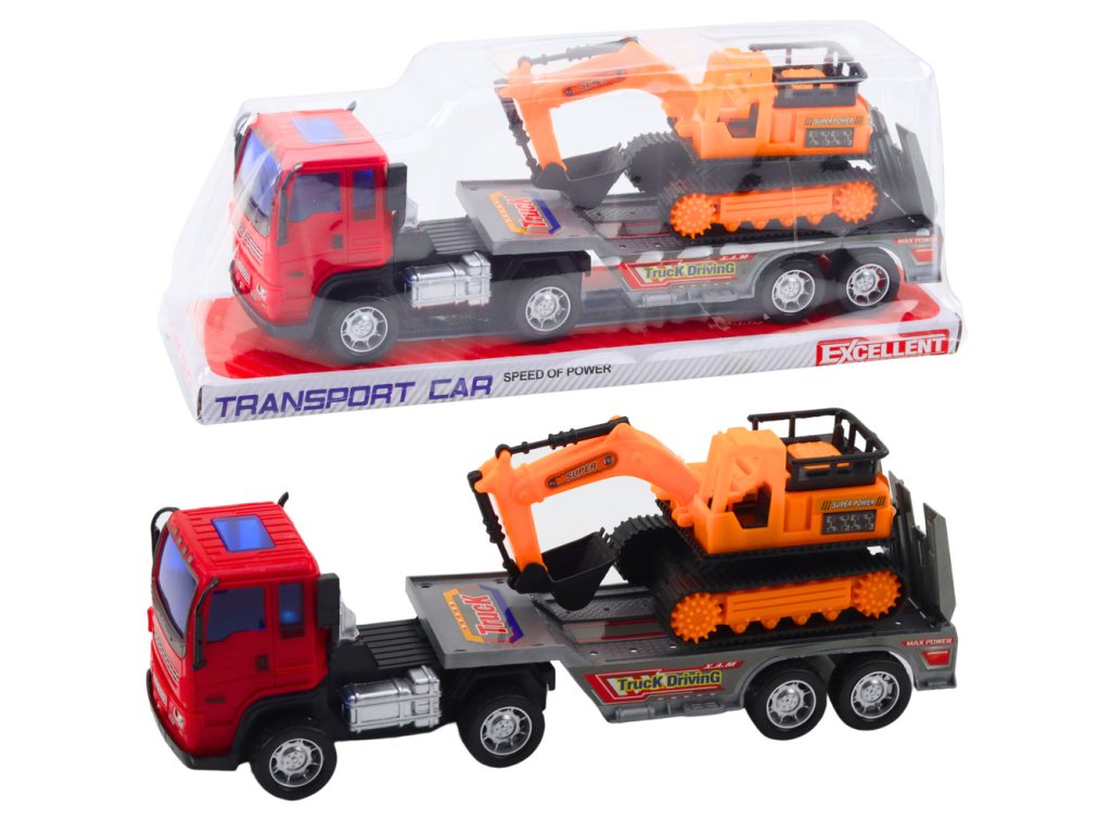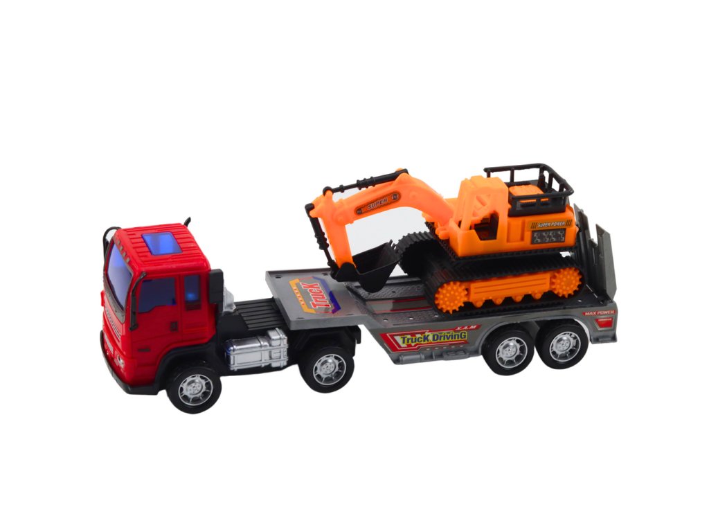 - Barva: Červený a stříbrný nákladní vůz, oranžový bagr