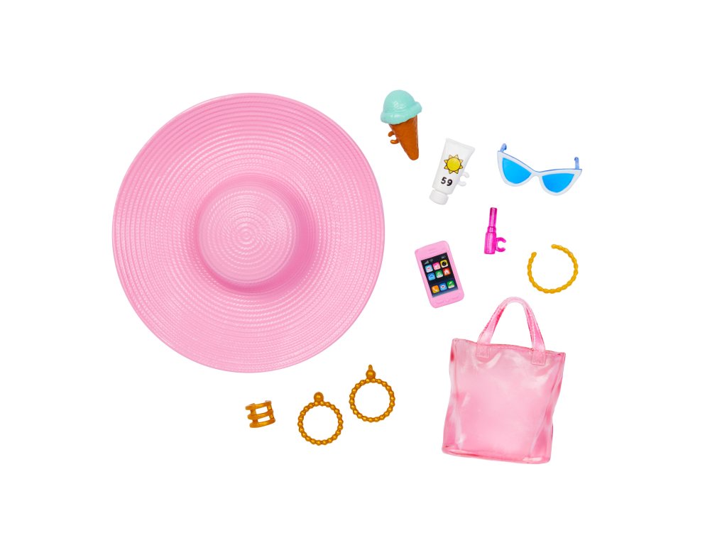 Sada obsahuje také módní plážové doplňky , které vám umožní vytvářet realistická dobrodružství na dovolené. Barbie nosí klobouk s širokou krempou , sluneční brýle s kočičími oky , zlatý náhrdelník a velký náramek . Díky tomu všemu vypadá jako opravdová stylová ikona!