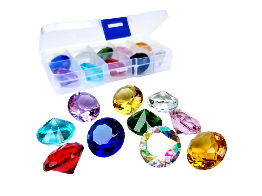 Barevné diamanty jsou všestranné – lze je použít při hledání pokladu, jako atrakce na narozeninovou oslavu, jako dekorace na stůl nebo jako rekvizity na focení. Díky bezpečné konstrukci a hladkým hranám je výrobek vhodný i pro děti, které jistě stráví mnoho hodin kreativní hry.