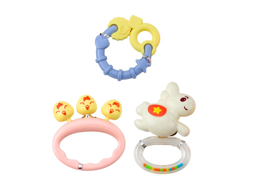 - Funkce: Chrastítka (vydává zvuky), kousátka (masíruje dásně), prvky podporující úchop a koordinaci