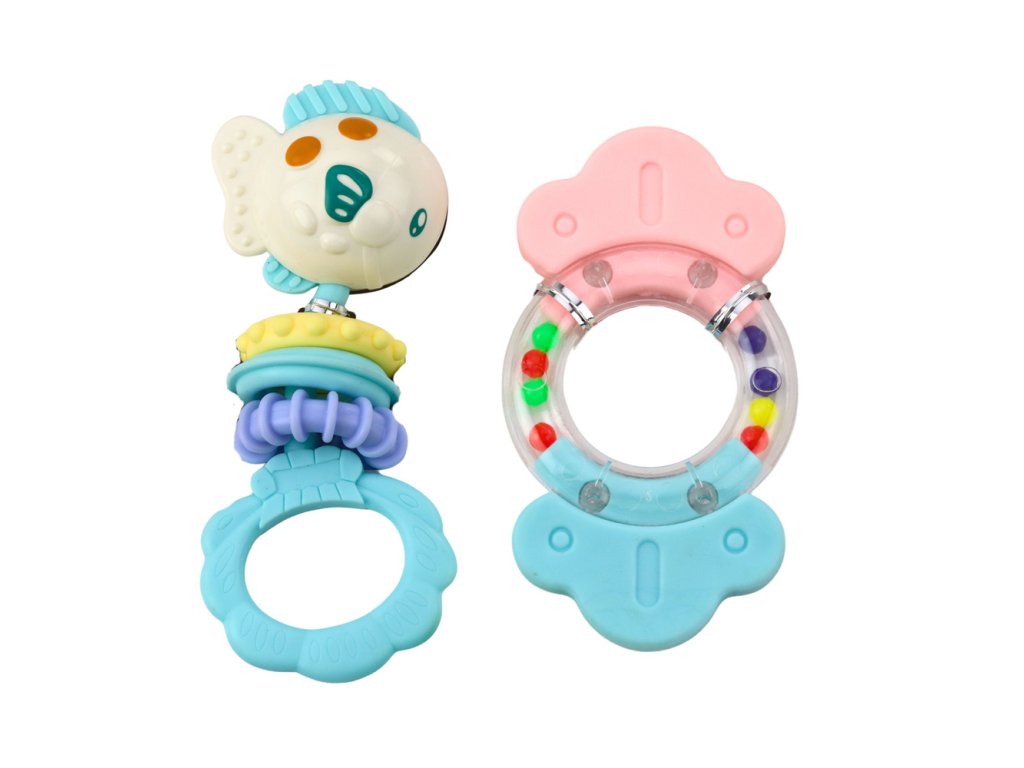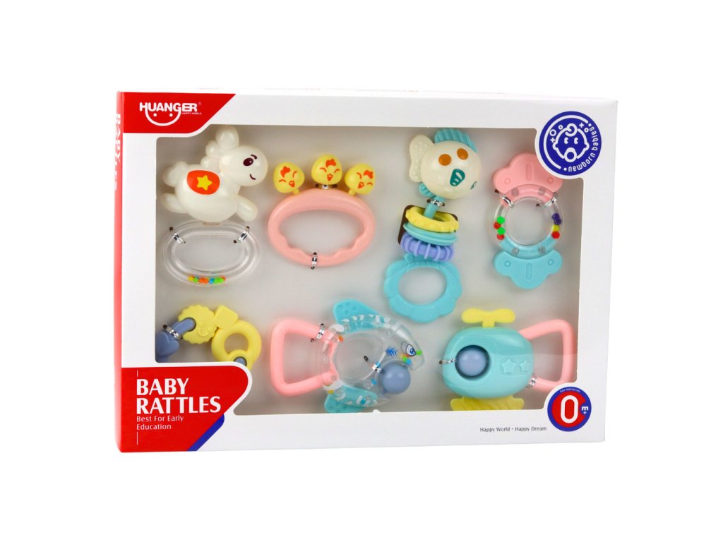 Sada obsahuje sedm kusů, každý s jinou funkcí – chrastítka při zatřesení vydávají jemné, příjemné zvuky, zatímco kousátka pomáhají masírovat dásně a snižují nepohodlí při erupci zubů. Všechny díly jsou ergonomicky tvarovány tak, aby seděly malým ručkám dítěte, což usnadňuje jejich uchopení a podporuje koordinaci rukou a očí.
