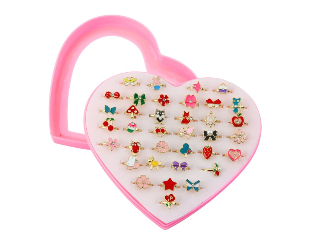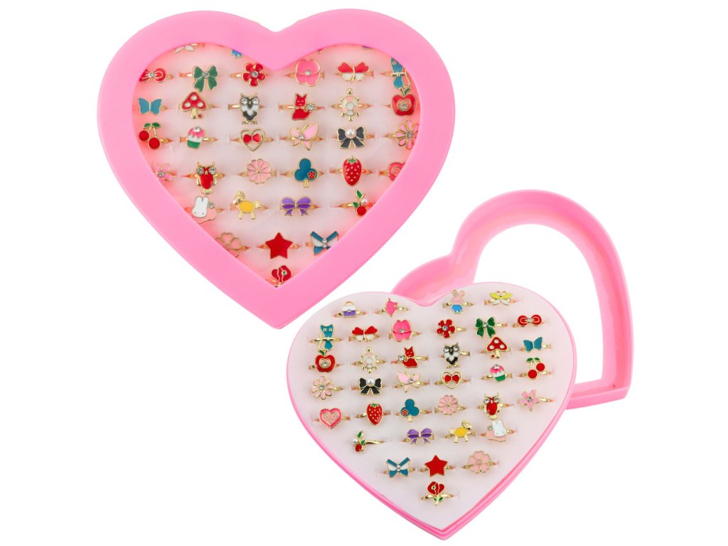 SADA 36 NASTAVITELNÝCH DĚTSKÝCH PRSTENŮ V KRABIČCE VE TVARU SRDCE