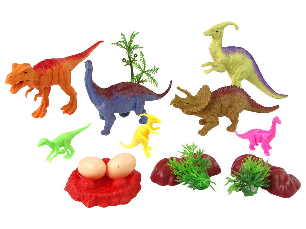 Kromě toho jsou zde tři malí dinosauři v různých barvách, které přinášejí další dynamiku a rozmanitost.