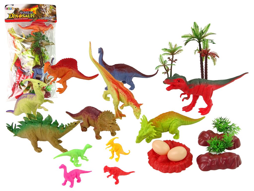 Sada obsahuje osm dinosaurů, z nichž každý představuje jiný druh. Jejich různé barvy jim dodávají jedinečnost a zároveň umožňují dětem objevovat rozdíly mezi nimi.