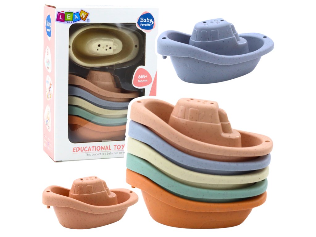 Sada naučných lodiček na koupání je jedinečná nabídka pro nejmenší děti od 6 měsíců. Sada obsahuje šest lehkých a barevných lodiček v tlumených pastelových barvách, které byly navrženy s ohledem na bezpečnost a pohodlí batolat. Každá loď má zaoblené hrany a na dotek příjemný povrch, díky čemuž je ideální volbou již od prvních koupelí. Díky ergonomickému tvaru čluny perfektně padnou do malých rukou, umožňují pohodlné uchopení, stohování na sebe, vytváření plovoucích struktur a vylévání vody.