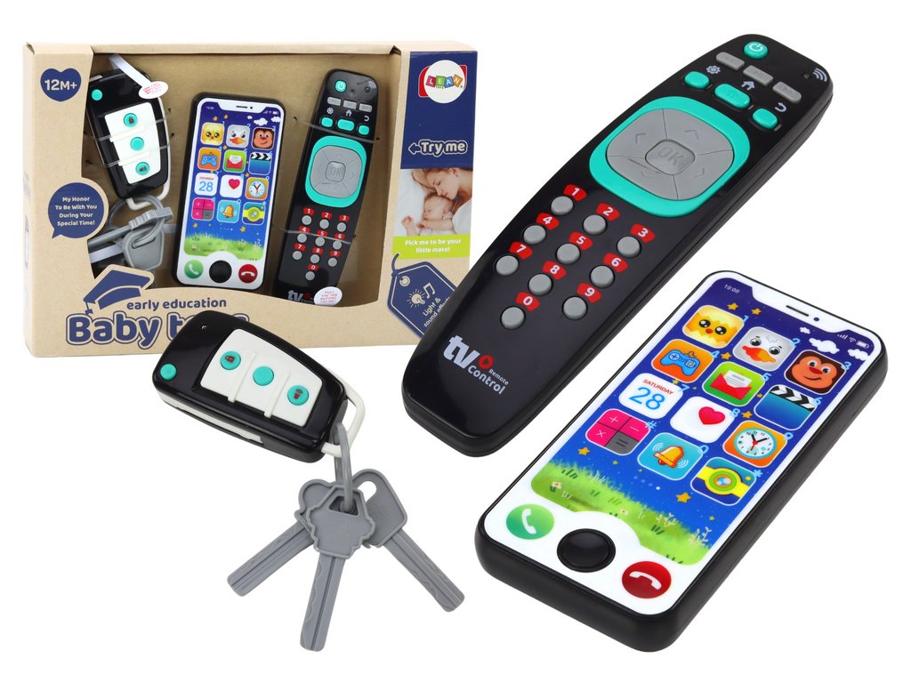 Sada realistických hraček, které vašemu nejmenšímu poskytnou spoustu zábavy a možnost objevovat svět zábavnou a vzdělávací formou! Naše sada obsahuje klíče od auta, dálkové ovládání a chytrý telefon – předměty, které děti rády napodobují po pozorování dospělých.