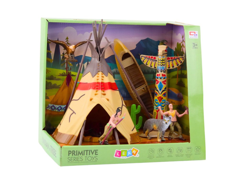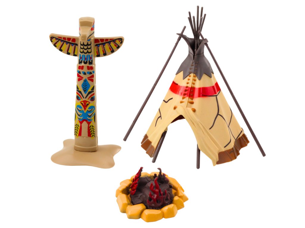 Sada obsahuje týpí pro svépomocné složení, které může fungovat jako centrální bod indiánské vesnice. Doprovází ji barevný totem plný symboliky, táborák napodobující plamen, realistická postava indiána s lukem, ale i divoká zvířata - vlk a majestátní orel. Všechny prvky jsou vyrobeny s důrazem na detail a jejich intenzivní barvy přitahují pozornost a podporují hru.