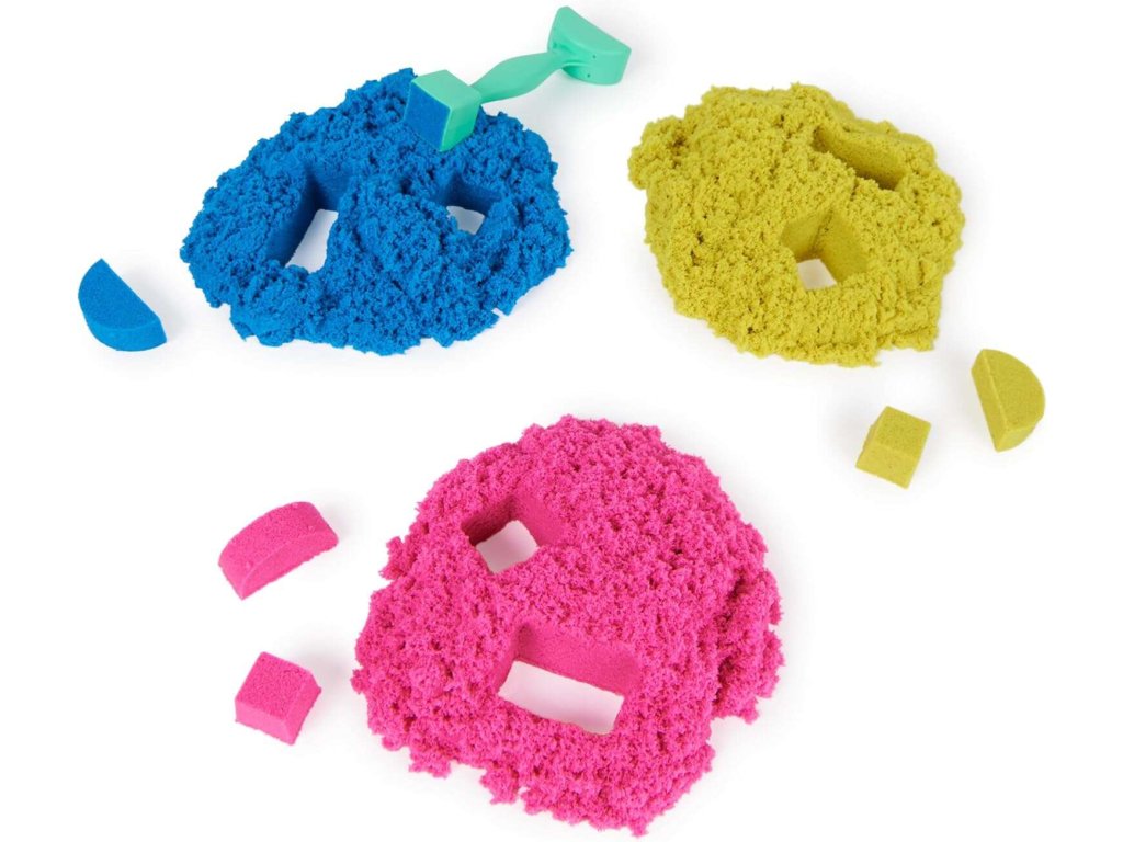 Sada na kinetický písekSquish n' Create obsahuje 3 barvy kinetického písku a příslušenství.