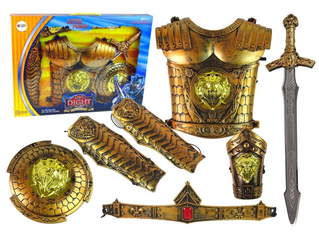 Většina lidí sní o rytířských dobrodružstvích, o kterých často slyšeli v pohádkách. Překročit hory a údolí a zachránit obyvatelstvo před monstry a krásné princezny před útlakem. Krásné zlaté brnění s doplňky přenese vašeho drobečka do pohádkového světa. Chrániče nohou, štít a brnění jsou vyrobeny z tvrdého plastu a během bitev poskytují silný náboj.