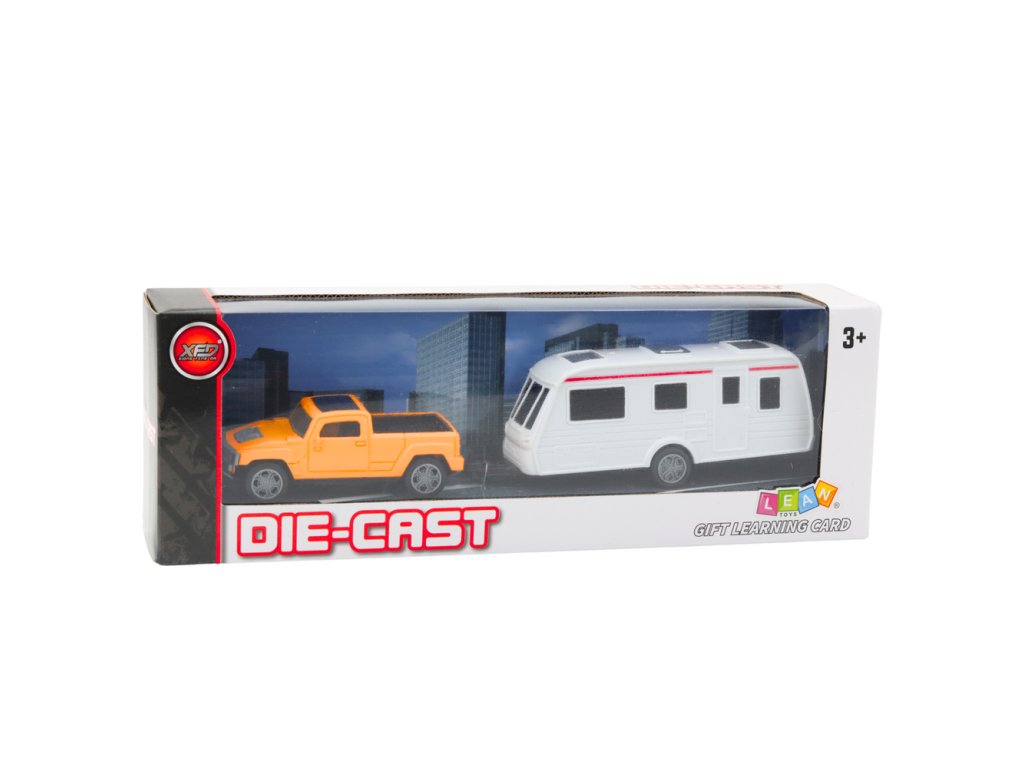 Vozidla byla vyrobena technologií tlakového lití, což znamená, že karoserie je vyrobena z kovu a vybrané prvky z odolného plastu. Tento výběr materiálů zaručuje odolnost a estetiku hračky. Karavan lze snadno odpojit od auta, což dává dítěti možnost vytvářet si mnoho různých herních scénářů – od prázdninových výletů po kempování a rodinné výlety.