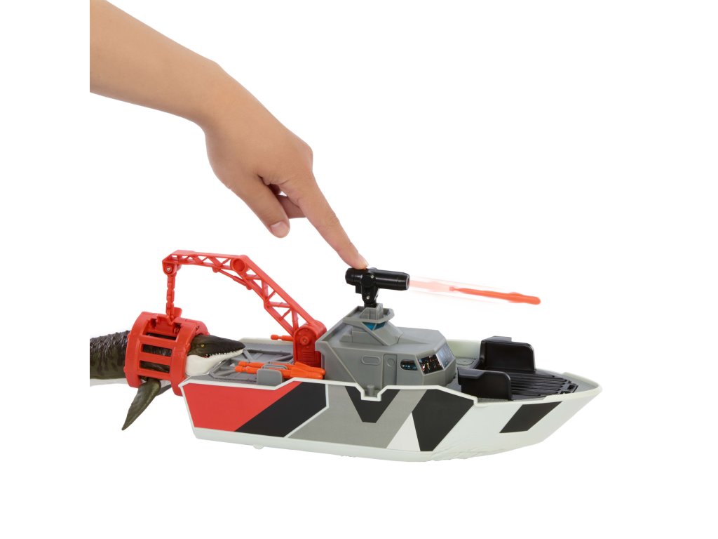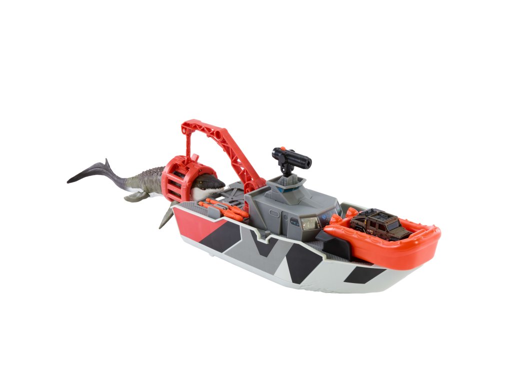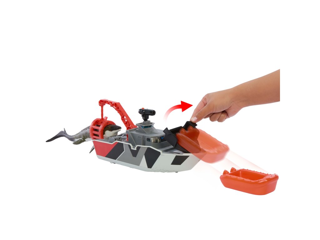 - Realistický záchranný člun - měří cca. 31,5 cm, s navijákem pro umístění Mosasaura na palubu a s koly pro pohyb po zemi.