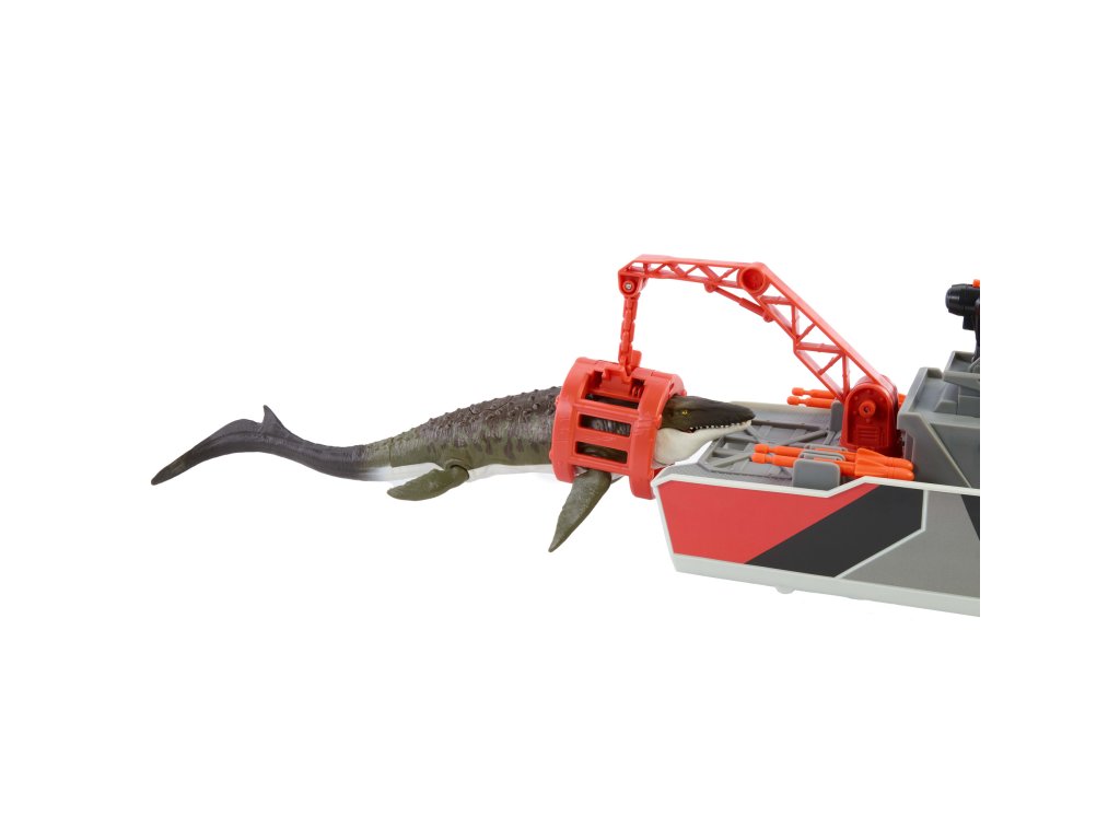Vytvořeno světoznámou společností Mattel. Tato sada kombinuje dvě oblíbené série: Jurassic World Rebirth s mocným Mosasaurem a Matchbox se záchranným člunem k zachycení plavajícího dinosaura.