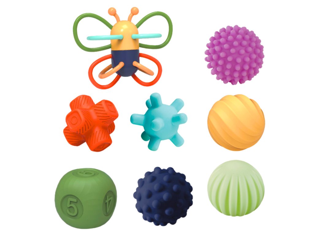 Sada obsahuje měkké míčky s výstupky, ohebná kousátka zajímavých tvarů, prvky na ždímání a drcení a také chrastítko s lehkou a šikovnou konstrukcí, které zvukem a tvarem upoutá pozornost dítěte. Všechny komponenty jsou vyrobeny z vysoce kvalitních, netoxických materiálů bezpečných pro děti - vhodné pro kousání, mačkání a zkoumání ústy a rukama. Povrchy jsou šetrné k pokožce a velikost prvků se ideálně hodí do ruky batolete.
