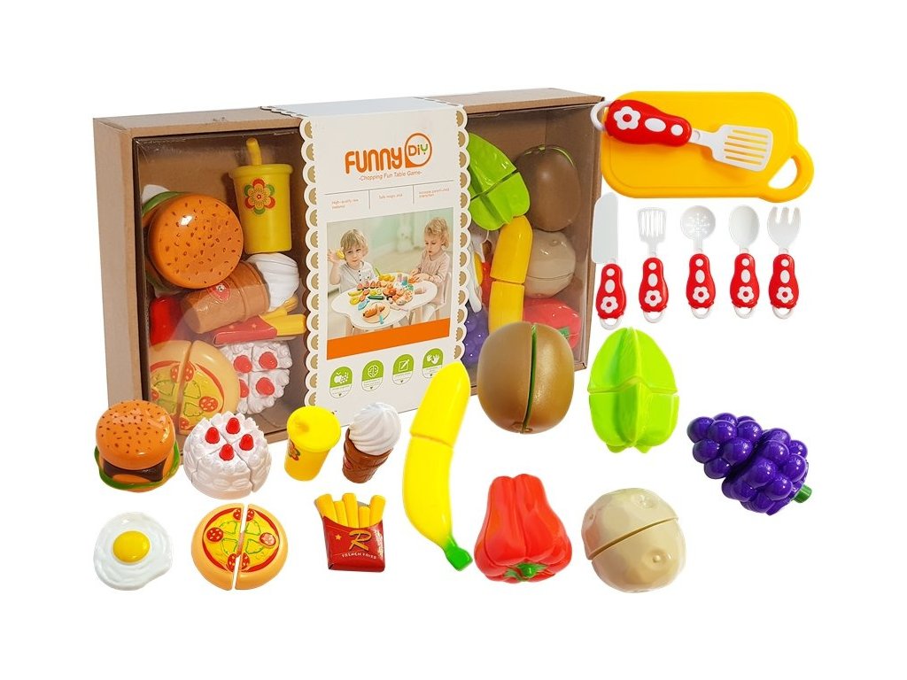 Zelenina a ovoce se dají rozpůlit, jsou k sobě připevněny suchým zipem, takže je později snadno složíte. Sada obsahuje kromě zdravých produktů i produkty rychlého občerstvení, např. chipsy, pizzu nebo sladkosti (dort, zmrzlina). Navíc sada obsahuje plastové příbory, nůž a malé prkénko. Uvnitř jsou návody a popisy všech produktů v angličtině.