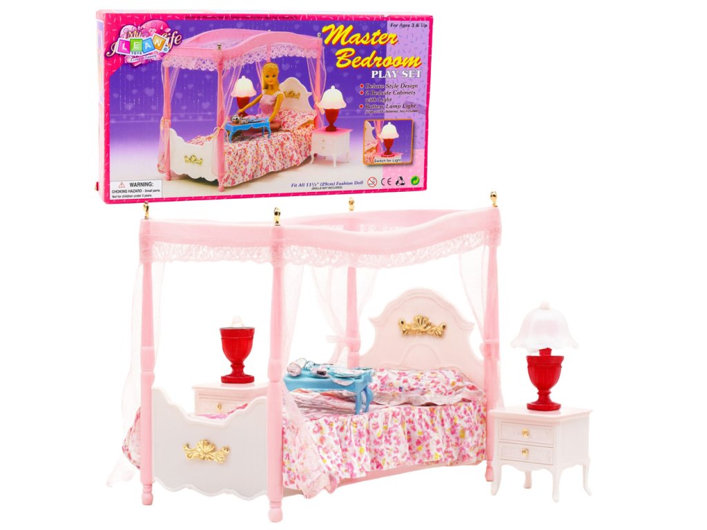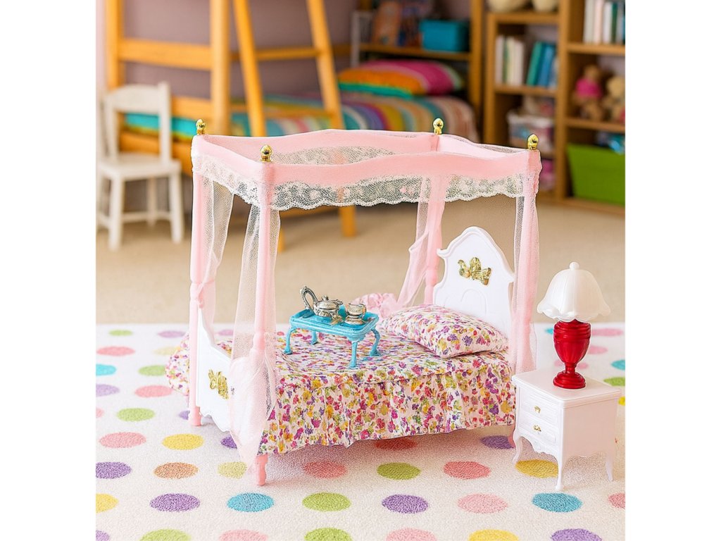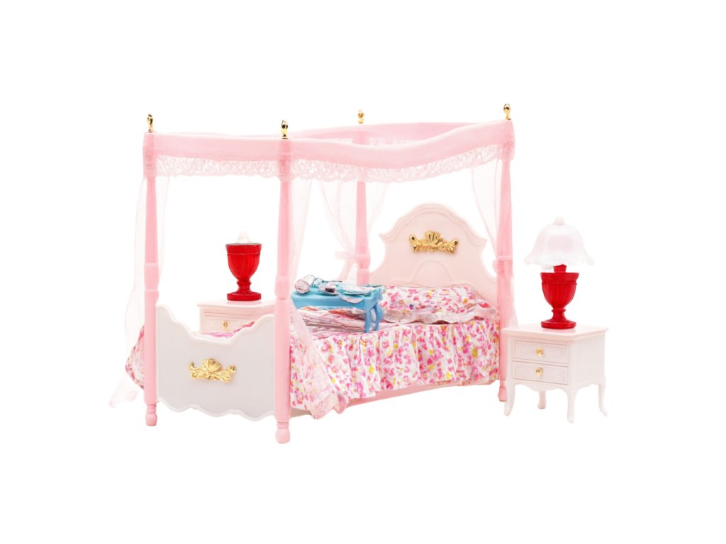 Sada nábytku pro panenky – postel s nebesy, noční stolky, lampy