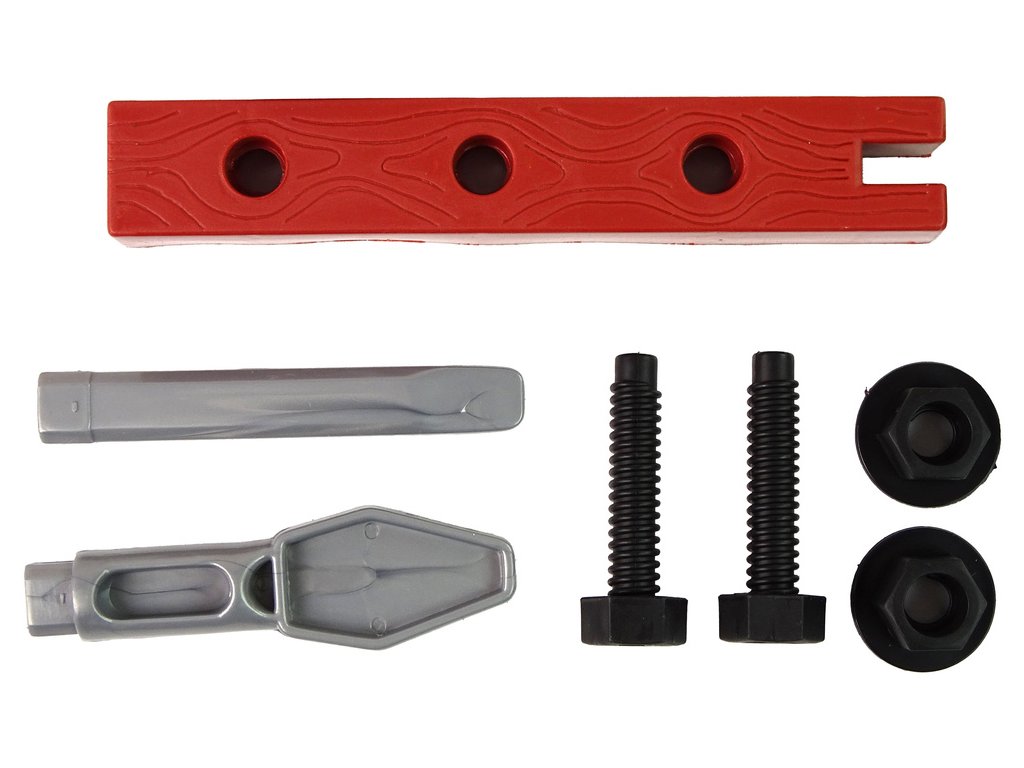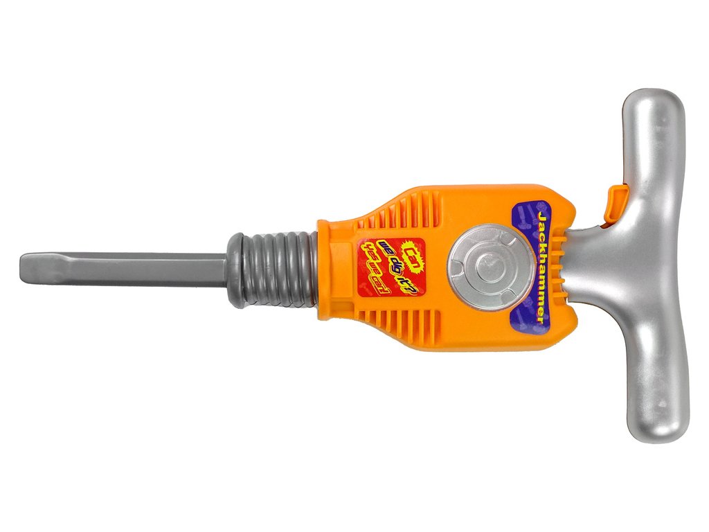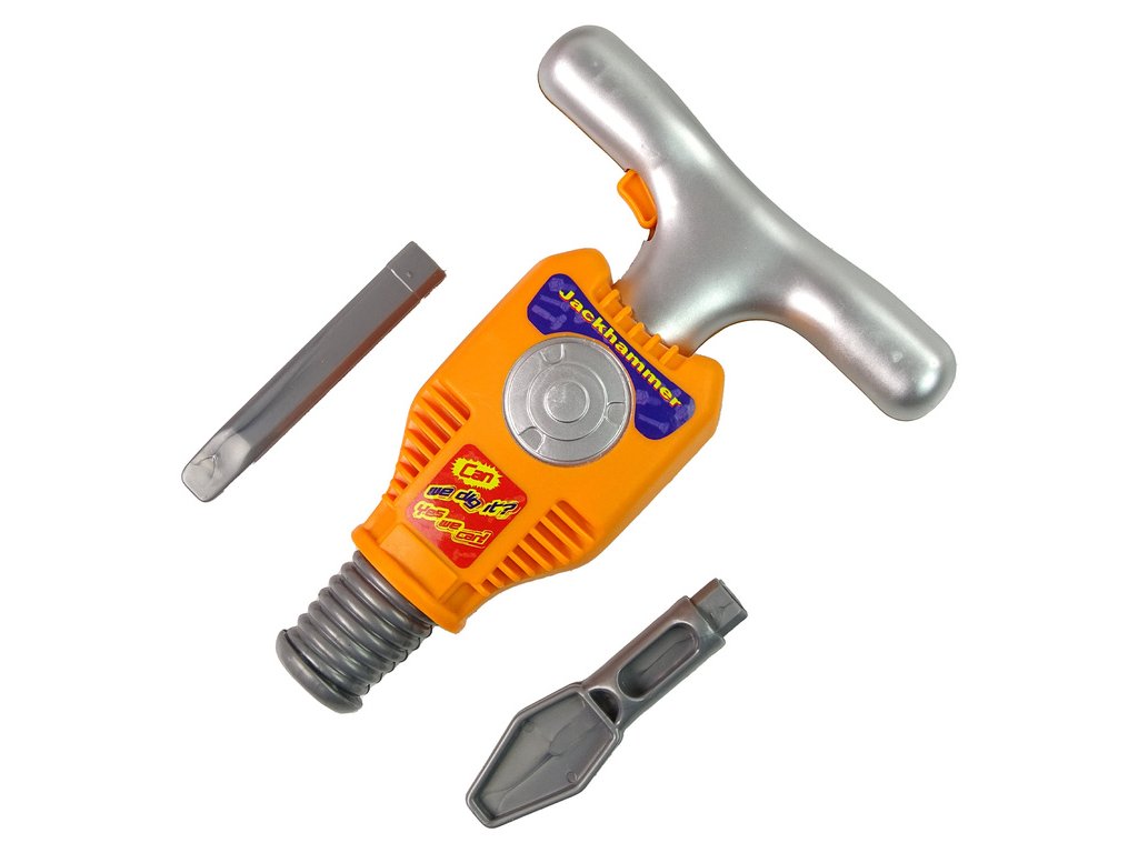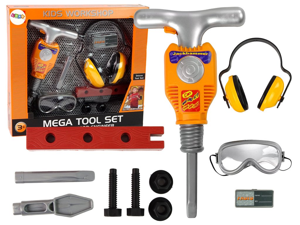 Celá sada je zabalena v obalu s průhlednou vitrínou, která zaujme dětské oči. Součástí sady jsou šroubky, které lze zašroubovat pomocí kladívka a správně nasazeného bitu. Další výhodou této sady je, že kladivo po vložení baterií a použití oranžového tlačítka viditelného na rukojeti začne pracovat svým charakteristickým způsobem. Proto má dítě navíc možnost nasadit si sluchátka a ochranné brýle, což poskytne ještě více zábavy, ale také bezpečnosti při používání sbíječky. Všechny prvky jsou vyrobeny z plastu a jsou pro děti bezpečné.