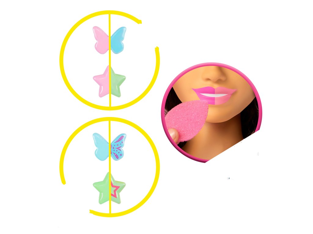 - Efekty změny barvy : sponky do vlasů změní barvu, když je ponoříte do vody, rty Barbie změní barvu, když je použijete houbou.