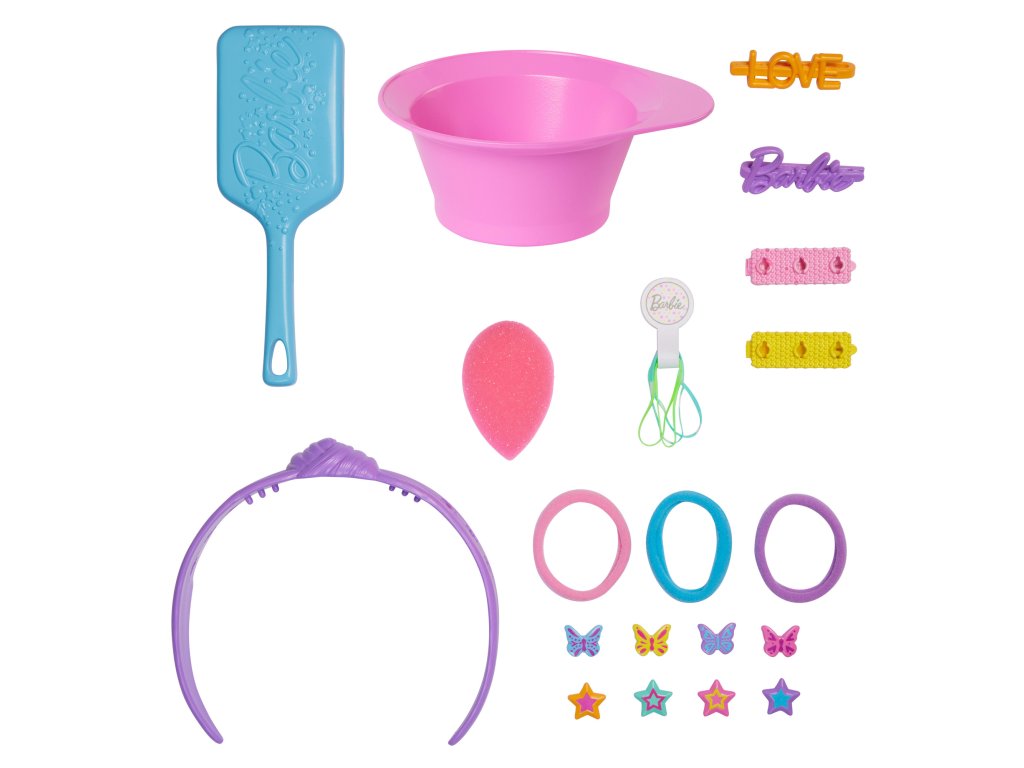 Sada obsahuje četné vlasové doplňky a dekorace, které jim umožní rozvíjet jejich kreativitu a představivost. Speciální sponky do vlasů změní barvu, když je ponoříte do misky s vodou, a další atrakcí je Barbiein make-up rtů měnící barvu – stačí použít houbičku a uvidíte velkolepou proměnu.