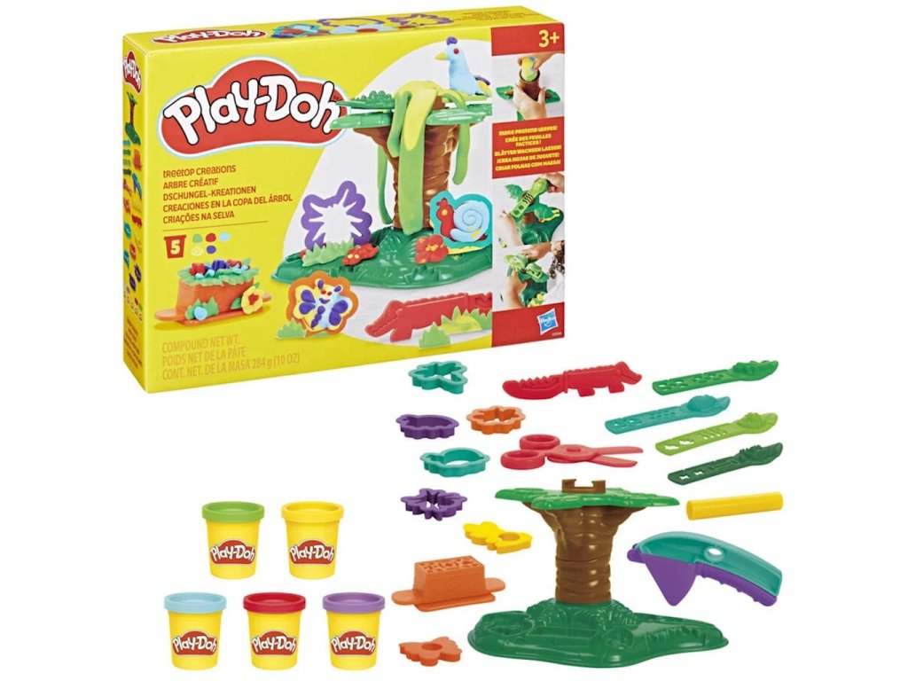 Výtvory z korun stromů od Play-Doh G0504S touto sadou Play-Doh mohou děti proměnit své divoké nápady v barevné výtvory! Strom z hračky vyroste v zábavné listy a liány z Play-Doh v různých tvarech. Použijte nástroje a formičky k vytvoření zábavných zvířátek a hmyzu, kteří budou žít v pomyslné džungli!