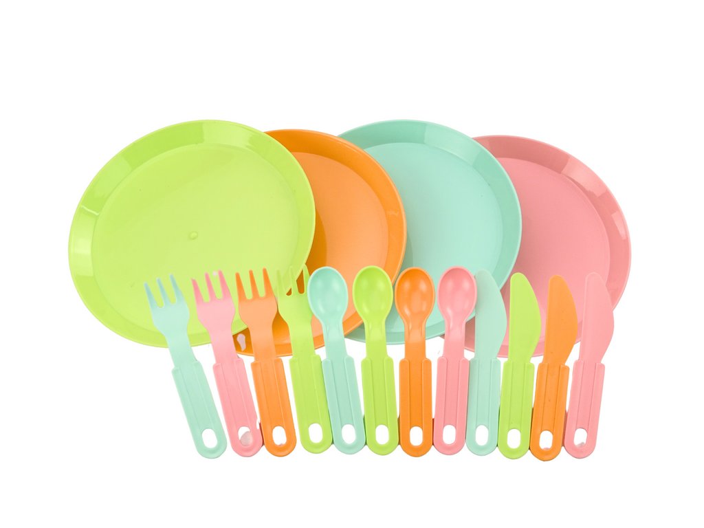 Krájecí prkénko nezbytné pro přípravu pokrmů, bezpečné pro děti. Sada příborů pro 4 osoby, včetně vidliček, nožů a lžic, která umožňuje "jíst" jídlo společně s přáteli nebo rodinou. Čtyři barevné talíře, na kterých můžete servírovat saláty a ovoce.
