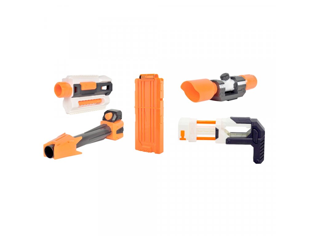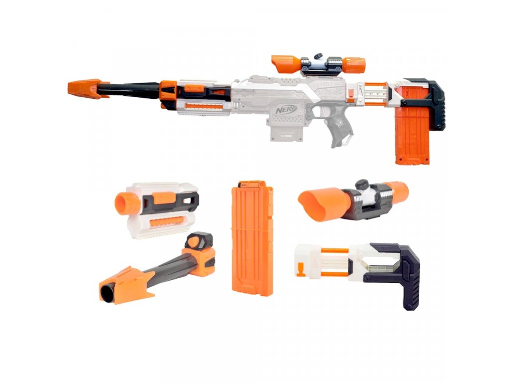 Sada příslušenství pro odpalovací zařízení Nerf: dlouhá pažba, prodloužení hlavně, dlouhá hlaveň, odstřelovací zaměřovač, zásobník CS-12