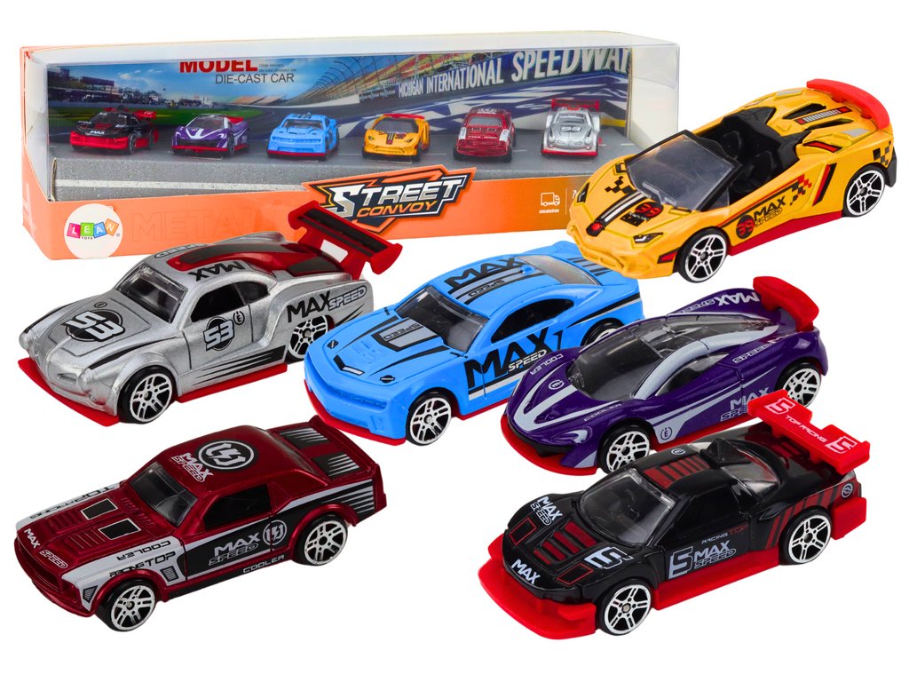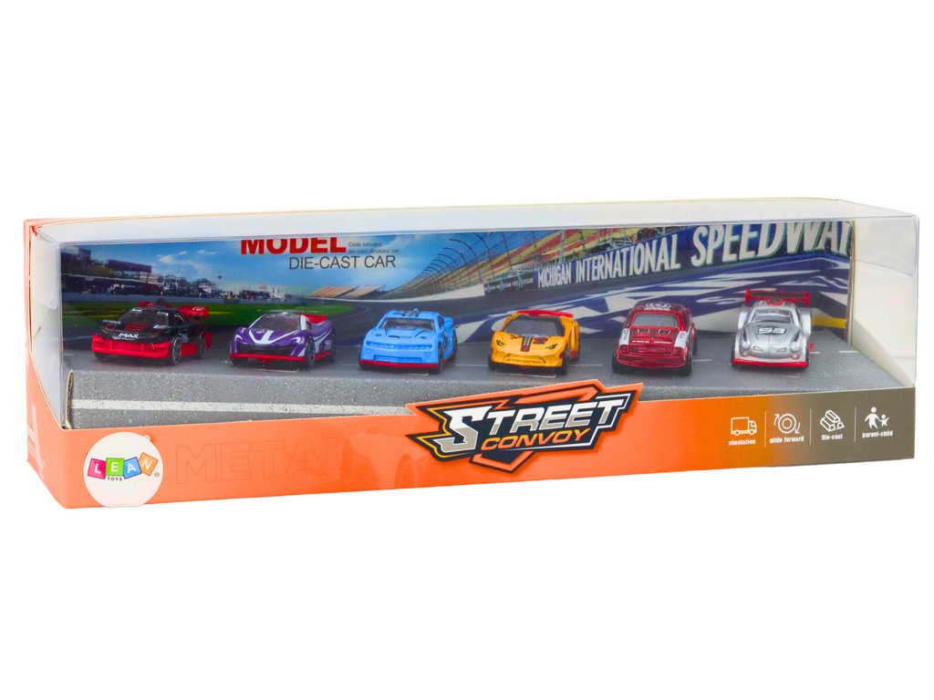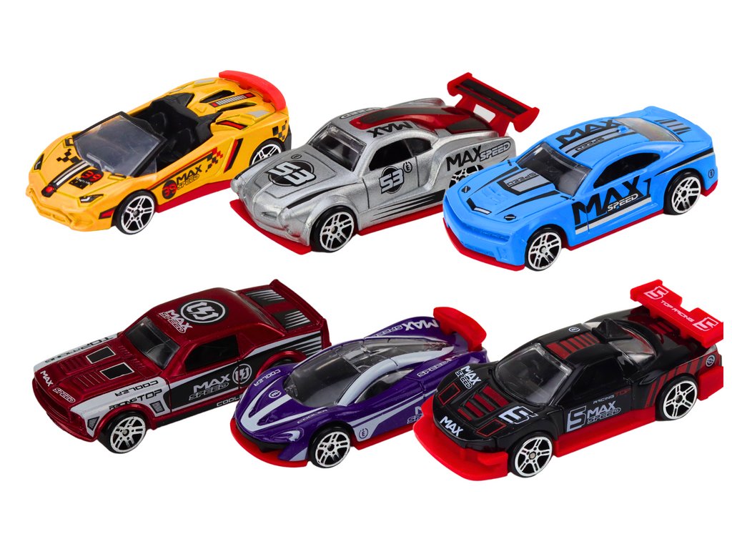 Každé ze šesti autíček v sadě má sportovní vzhled, který hře dodává dynamiku a realističnost. Děti si mohou představovat, že se účastní vzrušujících závodů. Autíčka jsou vyrobena z kovu, což zajišťuje jejich odolnost a pevnost a také jim dodává realistickou hmotnost. Autíčka jsou k dispozici v různých zářivých barvách, což činí sadu vizuálně velmi atraktivní. Každé autíčko má jedinečnou grafiku, která je dále odlišuje od ostatních a umožňuje dětem kreativní zábavu při vytváření vlastních příběhů a scénářů závodů.
