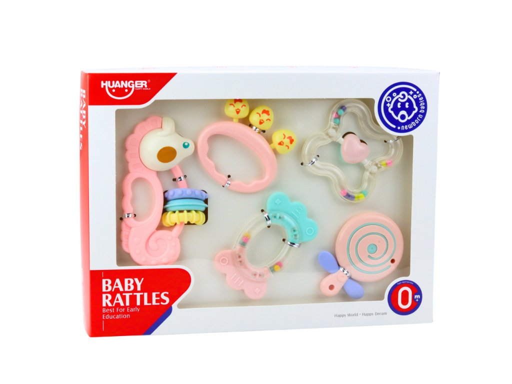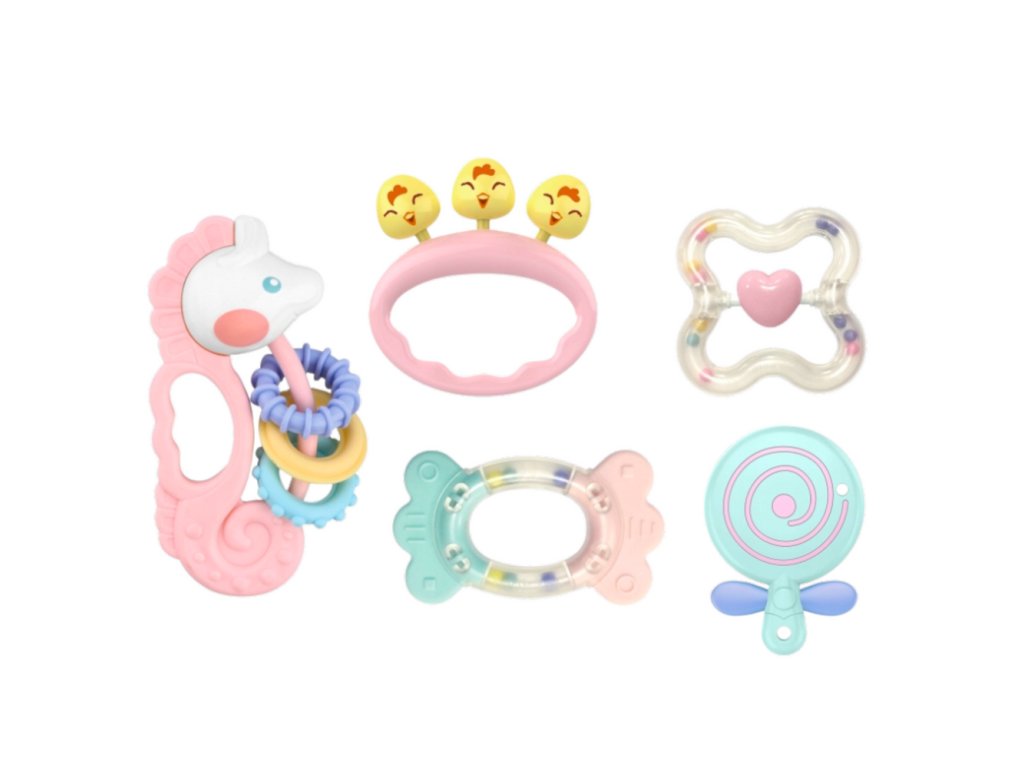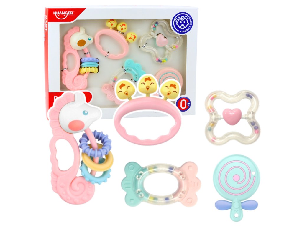 Sada senzorických chrastítek a kousátek pro miminka růžová 5 ks