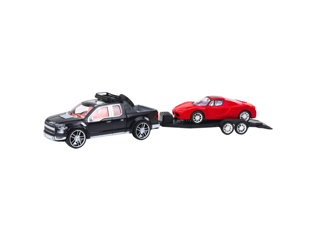 Přívěs je odnímatelný, což dětem umožňuje hrát si se sadou mnoha způsoby. Červené sportovní auto lze z přívěsu vyjmout a používat samostatně, čímž vznikají různé herní scénáře – od přepravy aut až po napínavé závody.