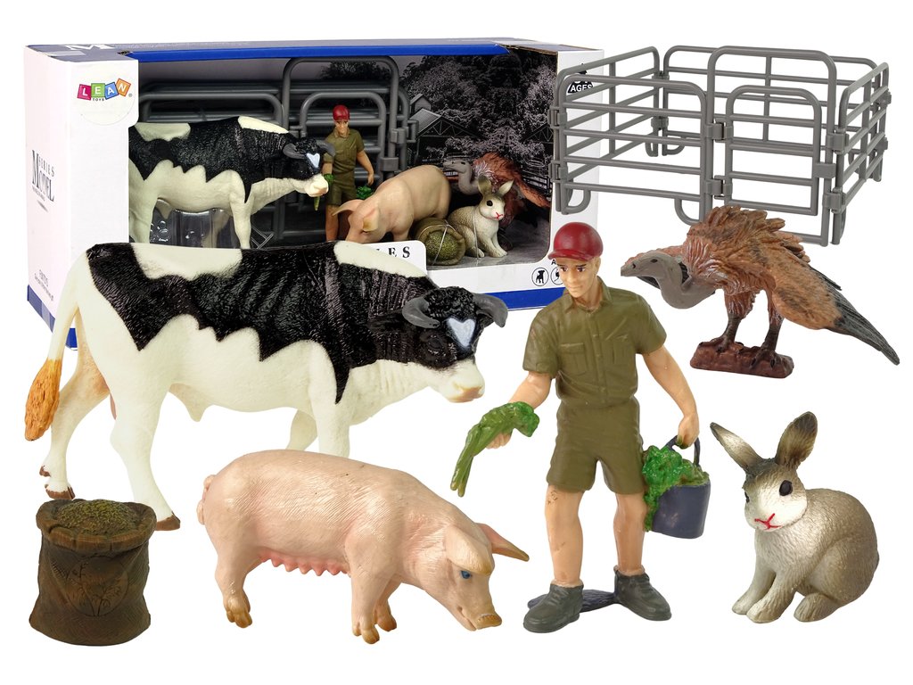 Sada obsahuje Usedlost s otevíracími vraty, farmáře s krmivem pro zvířata, hospodářská zvířata jako je kráva, zajíc, prase a sup a pytel krmiva.