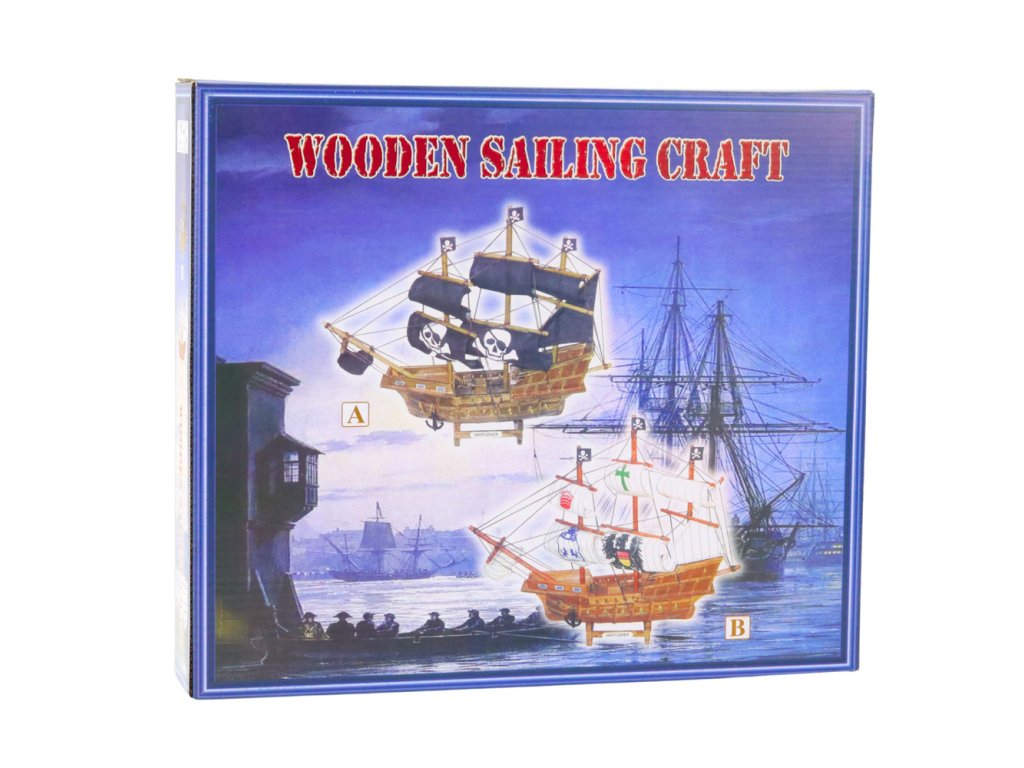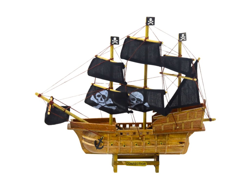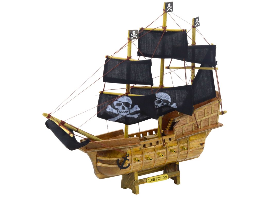 Tento model třístěžňové plachetnice v pirátském stylu je jedinečnou ozdobou pro milovníky námořní historie a dobrodružství. Model inspirovaný legendárními soukromými plavidly ze 17. a 18. století se vyznačuje trupem z přírodního dřeva s imitací střílny na bocích a jasně definovanou zádí a přídí. Černé látkové plachty s potiskem lebky a zkřížených hnátů a pirátskými vlajkami mu dodávají osobitý, osobitý vzhled, jasně evokující mořské nájezdníky a legendární svobodu širého moře.