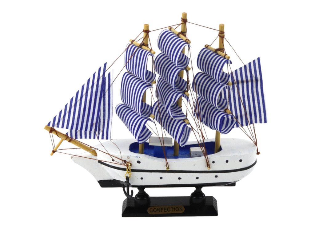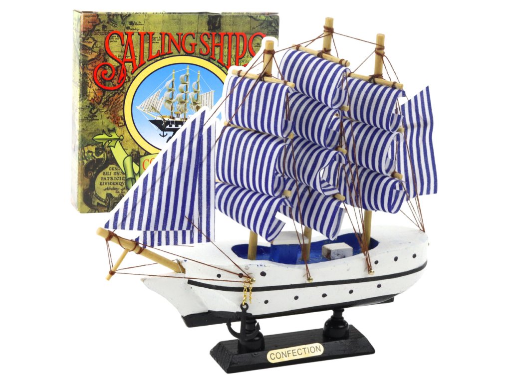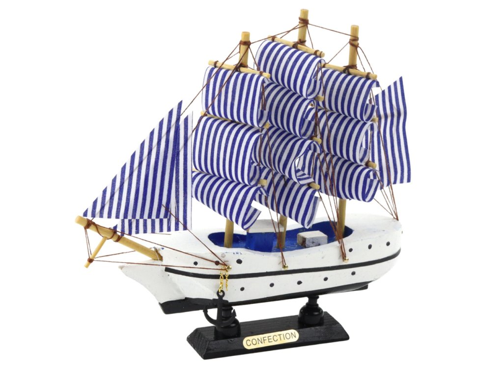 Tento okouzlující třístěžňový model plachetnice je klasickou miniaturou po vzoru plavidel z éry námořních obchodních cest. Bílý trup s černým pruhem a intenzivně modrým interiérem vyčnívá z ostatních modelů a vytváří lehký, dekorativní akcent ve stylu pobřežních přístavů. Výrazné textilní plachty s tmavě modrými pruhy a pečlivou takeláží zdůrazňují její výstavní charakter a evokují asociaci s mořským vánkem a otevřeným oceánem.