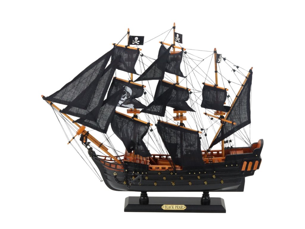 Tento působivý model pirátské galeony je věrnou replikou klasické plachetnice ze Zlatého věku pirátství. Jeho třístěžňový design, propracované lanoví, výrazné černé plachty a vlajky se zkříženými hnáty dodávají modelu jedinečný, temný charakter. Loď, po vzoru legendárních soukromých lodí, jako je Queen Anne's Revenge a Black Pearl, dokonale zachycuje ducha námořního dobývání a nespoutané svobody.